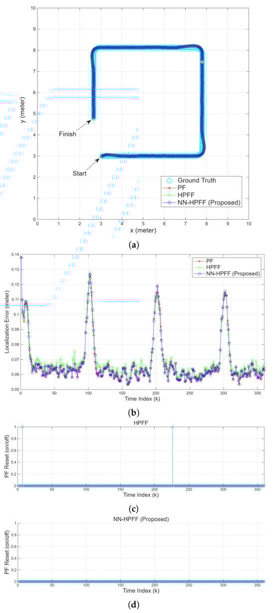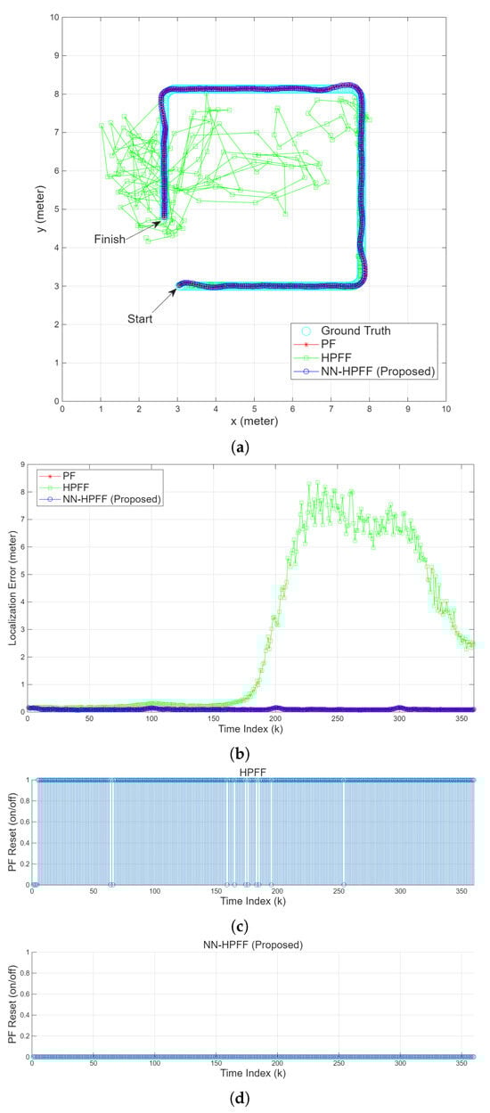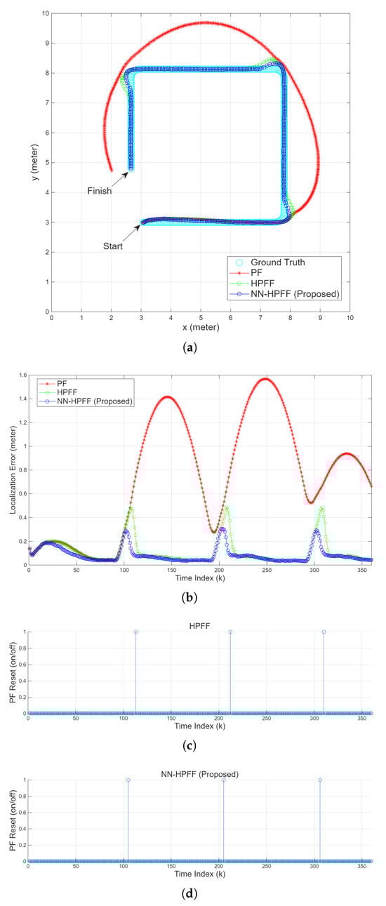 Figure 7b–d shows that NN-HPFF detected the increase in PF localization error earlier and performed the reset more promptly, whereas HPFF detected it later, leading to higher peaks in the localization error. However, as shown in