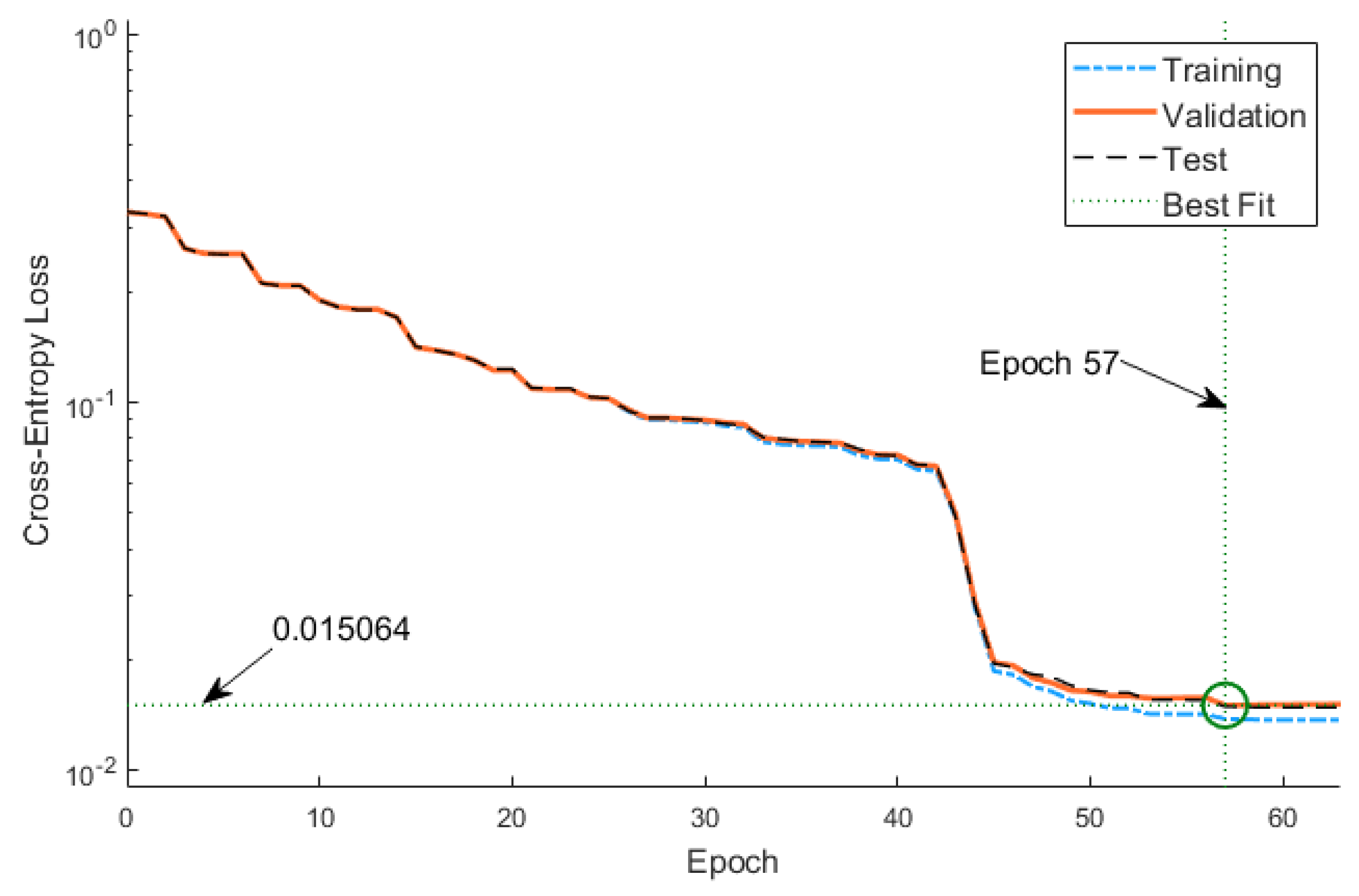 Figure 4 depicts the learning curve. We terminated the training at Epoch 57. As described above, the neural network is trained offline using the data obtained from 27 scenarios, and the trained network is then used in the NN-HPFF algorithm to detect PF failures.