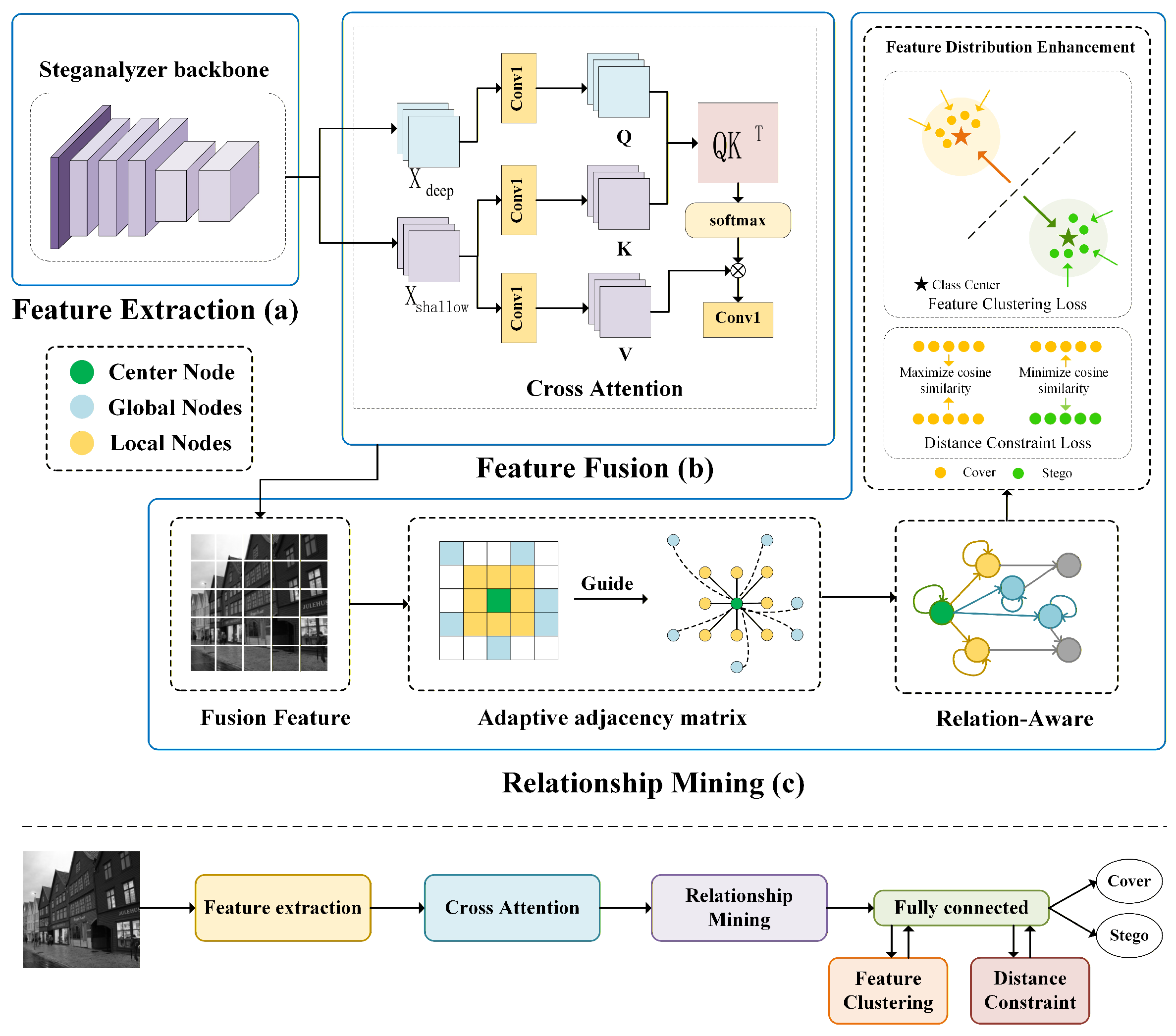 - We propose a steganalysis approach that leverages relationship mining, where local-focused and globally adaptive patterns are employed to guide graph relation modeling and capture global features. In the feature space, feature clustering and contrastive learning are incorporated to enlarge inter-class global differences, thereby generating a more discriminative decision boundary and maximizing the utilization of global relationships for classification.