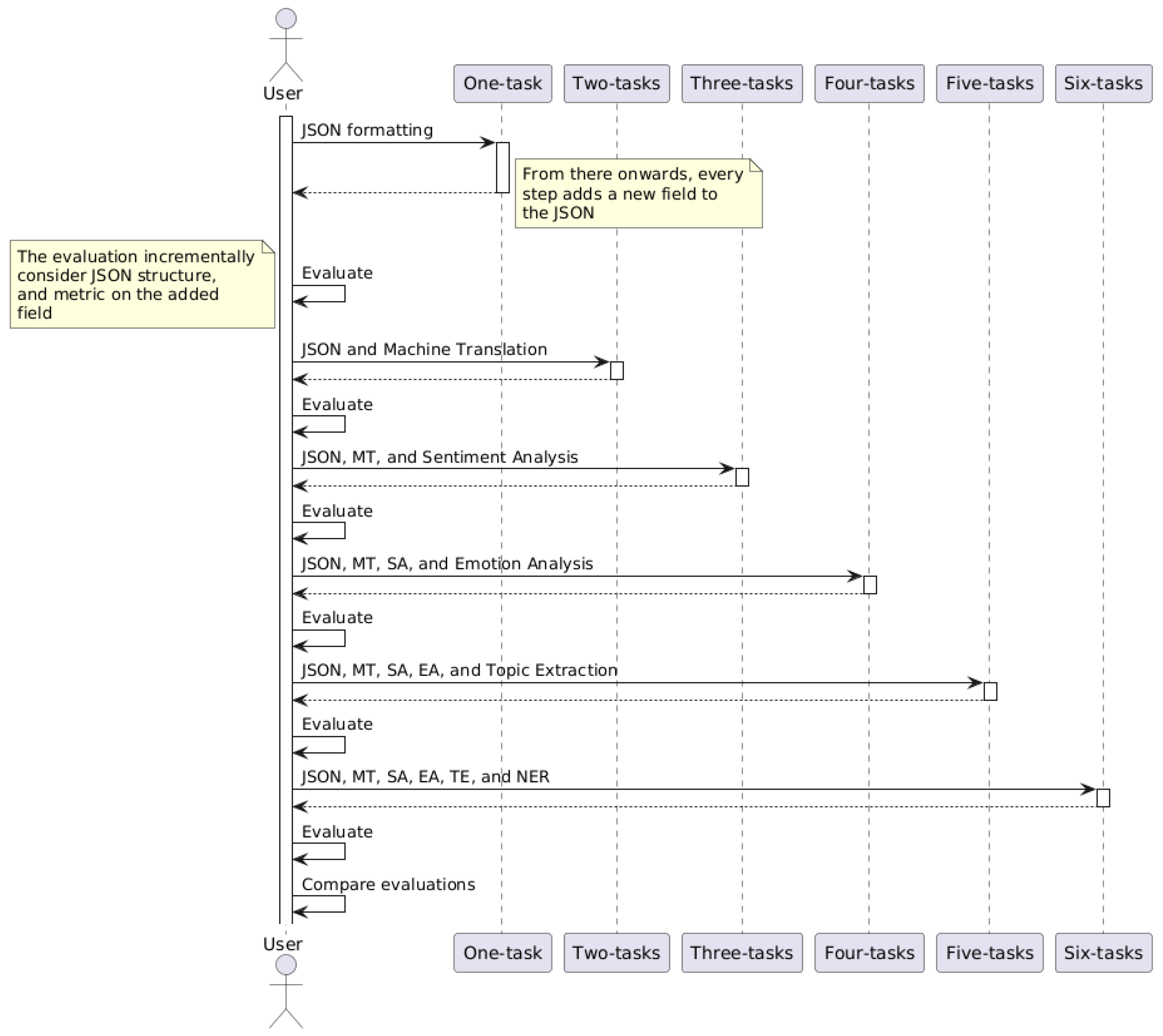 Model evaluation was conducted on six distinct NLP tasks: JSON formatting, Machine Translation (English-to-Italian), Sentiment Analysis, Emotion Analysis, Topic Extraction, and Named Entity Recognition (NER). These tasks were selected to represent a spectrum of cognitive and structural demands, ranging from semantic interpretation to strict output formatting. In the incremental prompting setup, a single-task baseline was established for each model, after which additional tasks were sequentially appended to the prompt in a fixed order. Performance was recorded at each stage to quantify both absolute accuracy and relative degradation. In Figure 1 a UML Sequence Diagram is presented to formally describe the experiment workflow.