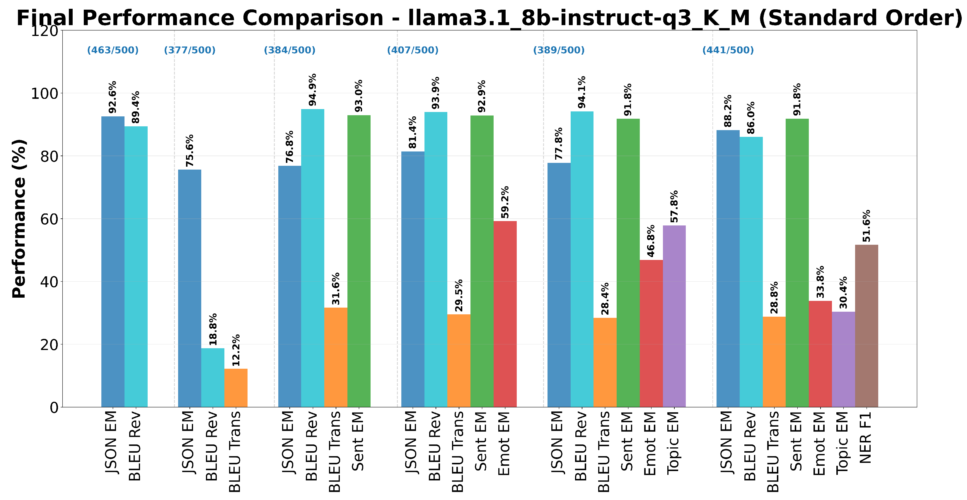 As shown in Figure 2, the model exhibited a substantial improvement in JSON formatting accuracy as task complexity increased, with exact match scores rising from 32.0 % in the single-task condition (Task 1) to 70.6 % in the complete six-task configuration (Task 6). The increasing trend is not strictly monotonic. The exact match drops of around 2 % between the fourth and fifth tasks, when Topic Extraction is added. This counterintuitive improvement suggests that the additional task constraints in multitask prompts may have provided structural guidance that enhanced the model’s ability to maintain proper JSON formatting, the corresponding increase in valid JSON count from 160 to 353 samples out of 500 further supports this interpretation.