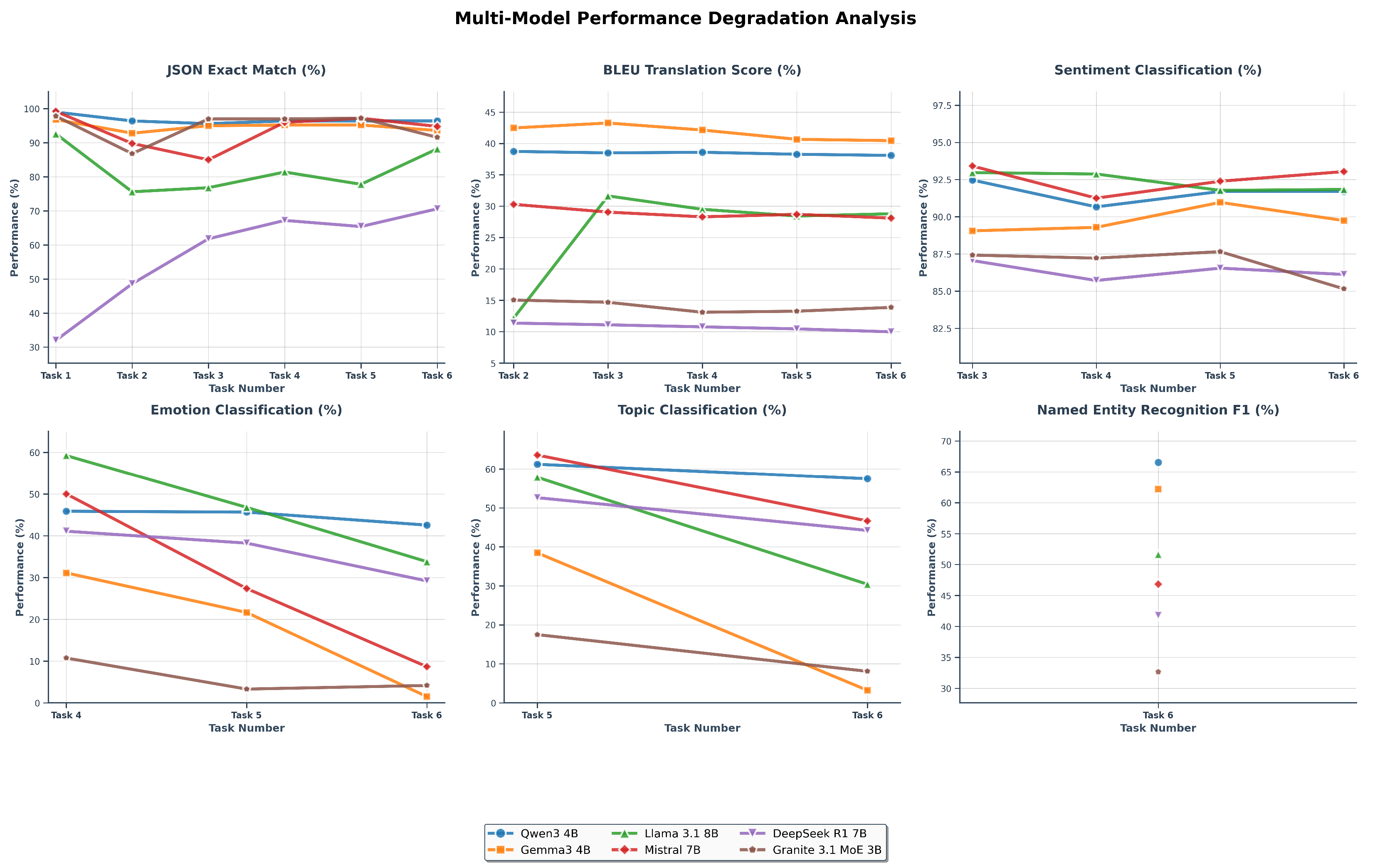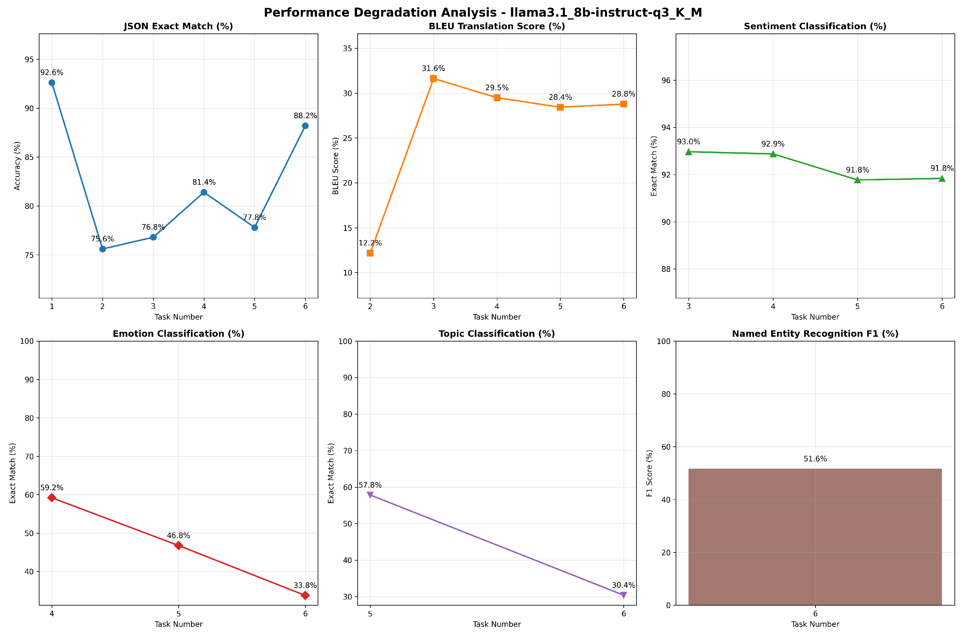 Formally, degradation was computed as shown in Equation (1). Where P t , m ( k ) denotes the performance of model m on task t at step k, and n is the total number of incremental steps (where k { 1 , , 6 } ). The total number of incremental steps n depends on the task itself, for example, JSON formatting is present in all six steps, while NER only appears in the final step, so n = 6 for JSON formatting and n = 1 for NER, and so on. The degradation score D t , m thus captures the cumulative performance loss (or gain) across all incremental steps for each task-model pair. A positive D t , m indicates a net performance drop, while a negative value would suggest improvement under increased complexity.