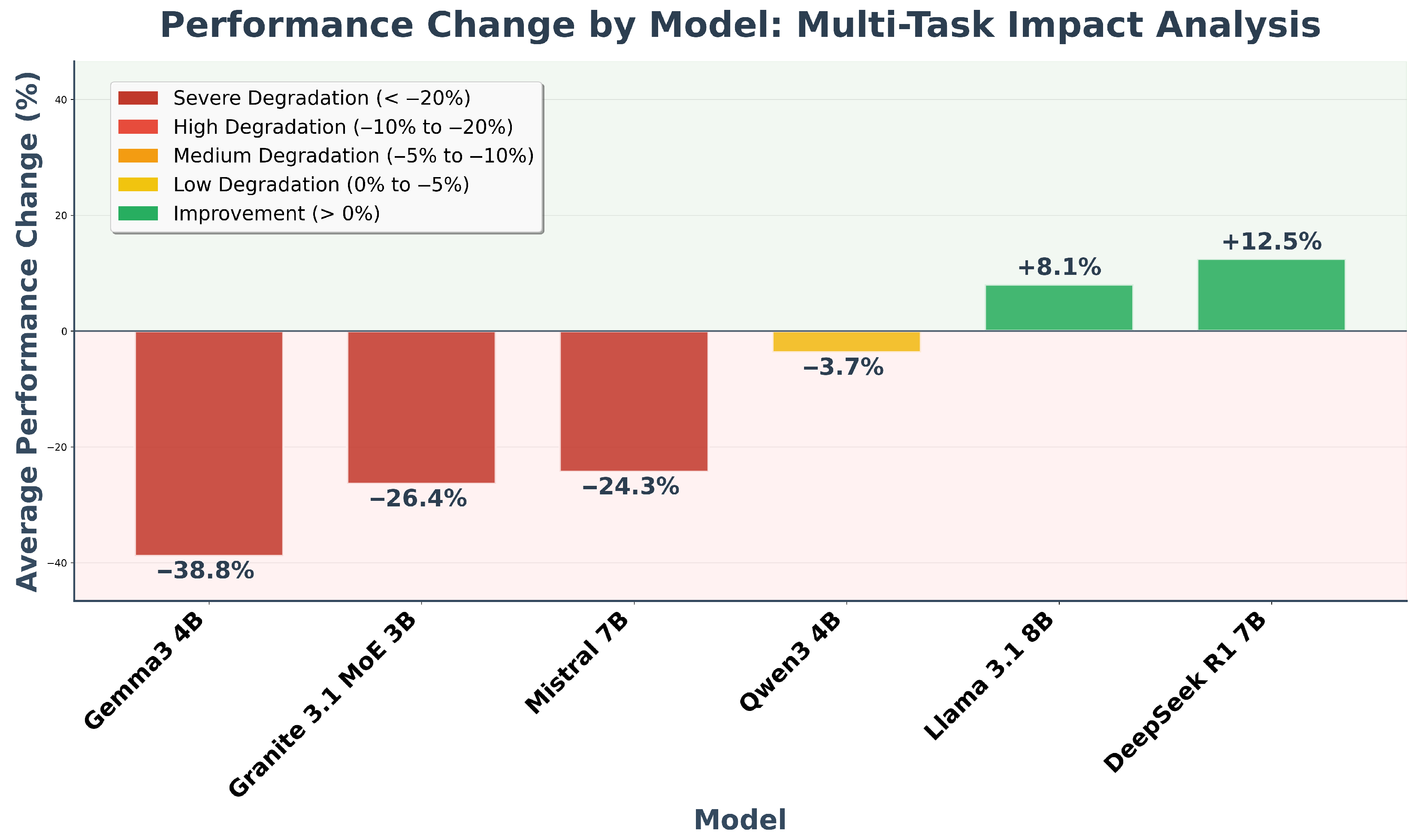 This process yields a fine-grained view of how structural tasks (e.g., JSON formatting) and semantic tasks (e.g., translation, emotion analysis) react differently to increasing multitask demands, enabling the identification of task-specific and architecture-specific degradation patterns.