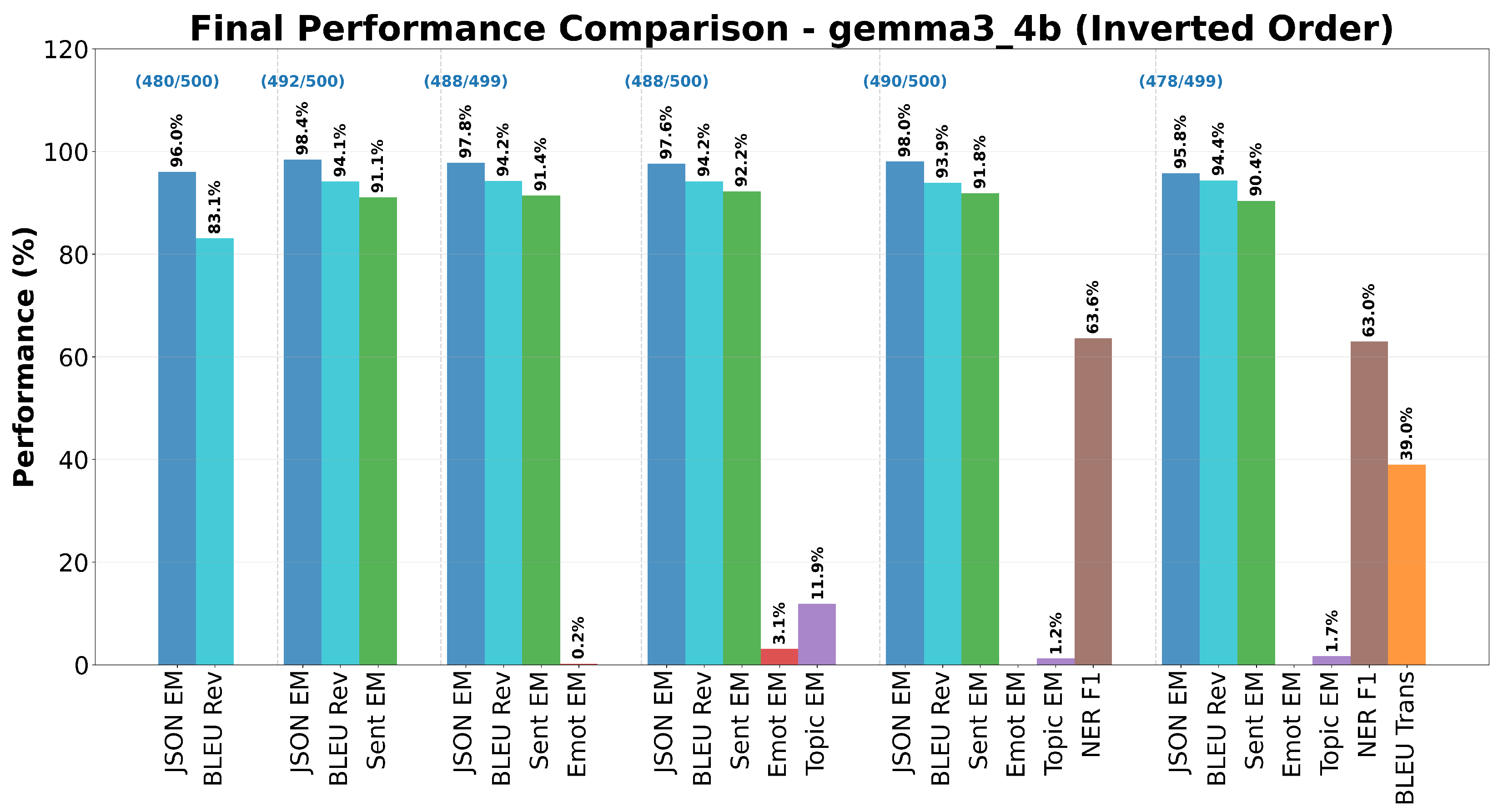 Figure 19. Final performance comparison for Gemma 3 4B across six tasks in Inverted Order.