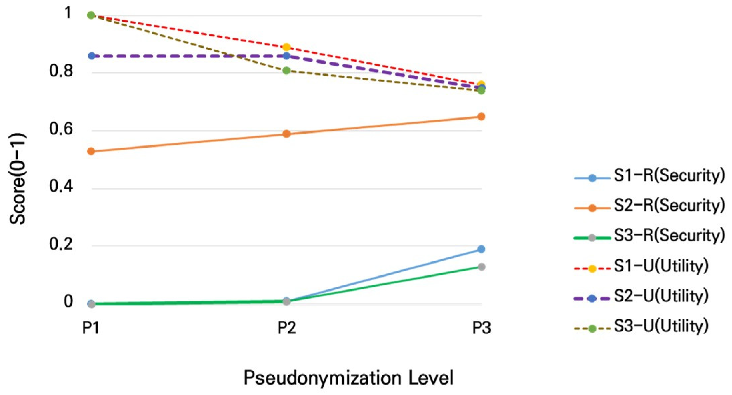 The utility value (U) of pseudonymized data is measured by averaging the information loss after pseudonymization and the similarity between the original and pseudonymized data or by calculating a weighted average of the two values. Information loss evaluates the extent to which the pseudonymized data differs from the original, while original similarity assesses how closely it retains the characteristics of the original.