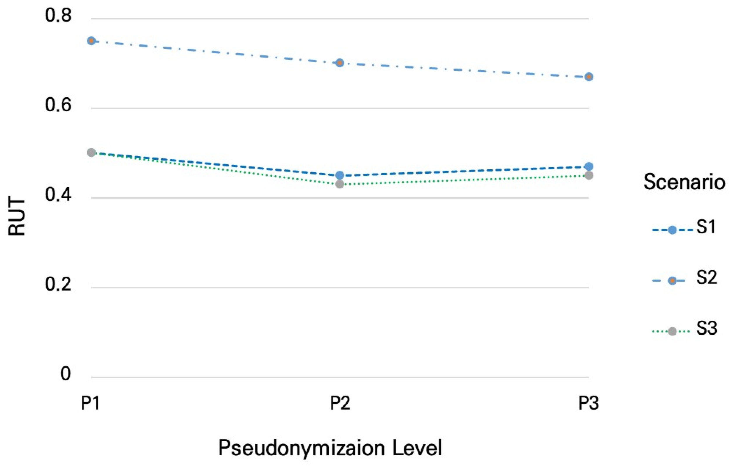 the mean absolute deviation is 1. This indicates that, on average, each value shifted by 1 due to pseudonymization. The result ranges from 0 to ∞. A value of 0 indicates no difference between the original and transformed data, meaning that information loss is negligible and data similarity is preserved. Conversely, larger values indicate greater differences between the original and transformed data, which implies higher information loss and reduced accuracy and utility. In other words, smaller values reflect minimal differences, lower information loss, and higher data utility, whereas larger values correspond to greater differences, significant information loss, and diminished data utility.