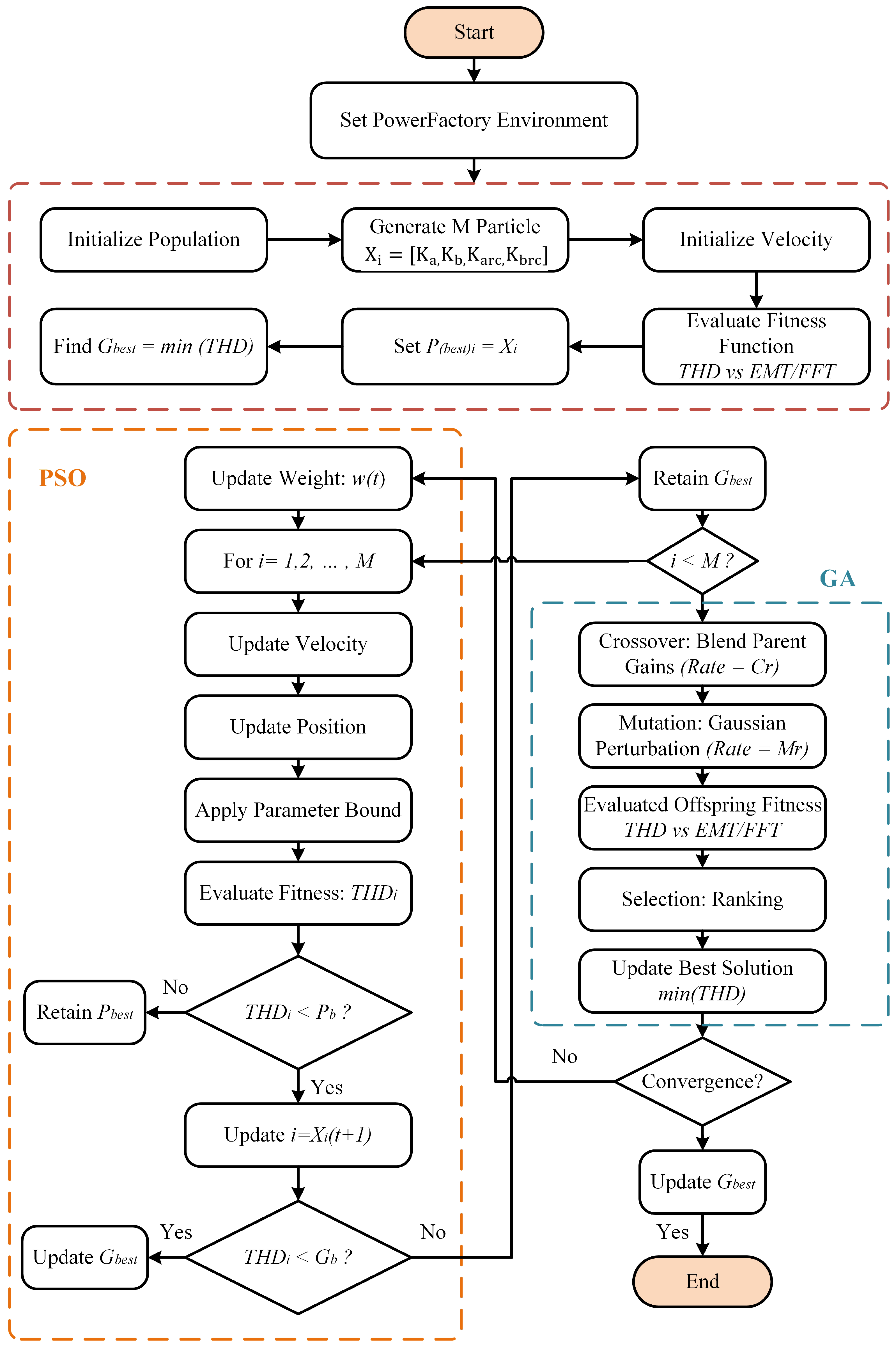 To bridge these gaps, this study (i) deploys a stationary-frame PR controller directly in realistically unbalanced multi-phase distribution networks, eliminating the need for sequence decomposition, and (ii) proposes a hybrid PSO–GA that combines PSO’s rapid convergence with GA’s global search diversity for robust parameter tuning.
