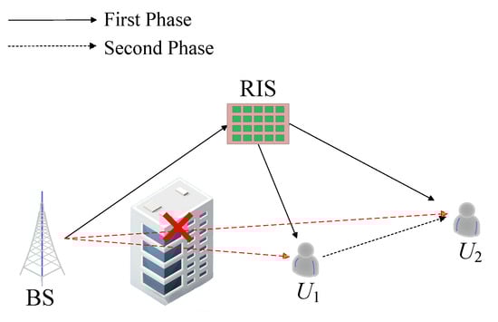 As shown in Figure 1, we consider a RIS-assisted cooperative NOMA network utilizing short-packet transmission with hardware impairments. The system comprises a single-antenna BS, two single-antenna users, i.e., a near user and a far user , and a RIS with M reflecting elements. Similar to [27,37], we assume that obstacles block the direct links between the BS and both users (), thus necessitating the use of the RIS for reliable transmission. This assumption is based on the negligible impact of the direct links when the number of RIS elements is large [38]. To evaluate the theoretical performance gain and derive meaningful insights regarding the interplay between RIS and cooperative NOMA, we assume that the BS possesses perfect channel state information (CSI) for all communication links. Although achieving perfect CSI is generally challenging, numerous studies have recently introduced effective channel estimation techniques suitable for RIS-assisted wireless networks, which can be incorporated into our system to obtain accurate CSI [39,40]. For example, Wei et al. [39] proposed an alternating least squares method to achieve continuous and low-complexity estimation of all channels. Moreover, compressive sensing and deep learning were used by Taha et al. [40] to develop two new channel estimation schemes for RIS-assisted wireless systems. The data transmission procedure consists of two phases. In the first phase, BS broadcasts a superimposed signal x containing bits for and bits for with power P over blocklength L. Subsequently, serves as a DF relay, processing, and retransmitting signals intended for in the second phase.