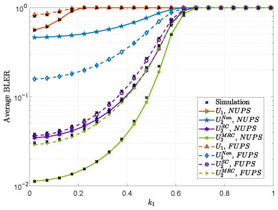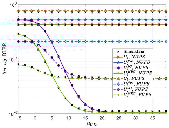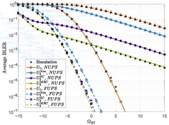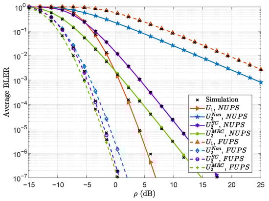 Figure 6 plots the average BLER under the NUPS and FUPS versus with , and . As increases, the average BLER for all cooperative schemes (SC and MRC) under the NUPS and FUPS decreases significantly. This trend confirms that a high-quality inter-user channel is crucial for enabling effective user cooperation, which is a cornerstone of the proposed system’s reliability enhancement. In addition, when is small, the performance of SC for the far user reduces to the conventional non-cooperative NOMA, while it approaches the performance of MRC under large . Therefore, SC demonstrates remarkable adaptability, serving as a low-complexity alternative that achieves near-optimal performance when inter-user channel conditions are favorable.