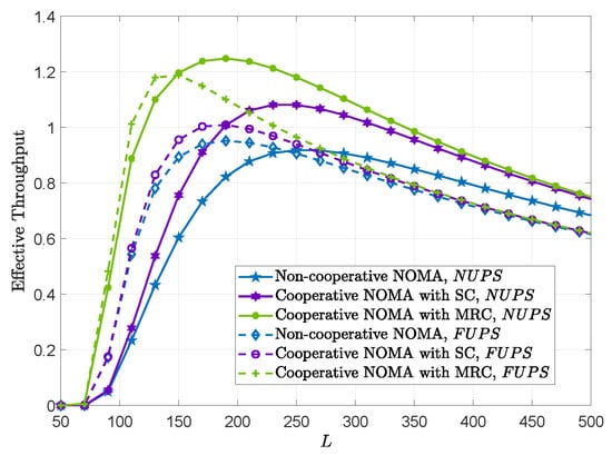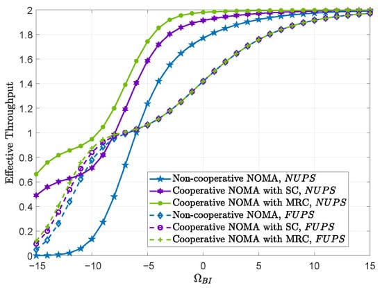 Figure 8 plots the effective throughput under the NUPS and FUPS versus with dB. For all schemes, the effective throughput increases significantly with improving in the low-to-medium range. This is expected, as a stronger BS-to-RIS link enhances the overall transmission reliability. However, when is high, the effective throughput for all schemes begins to saturate, as the system becomes limited by the transmission rates. In addition, cooperative NOMA schemes consistently outperform the non-cooperative NOMA, particularly in the low-to-medium region. This gain is attributed to the diversity advantage offered by cooperation, which mitigates the effects of fading and improves reliability.