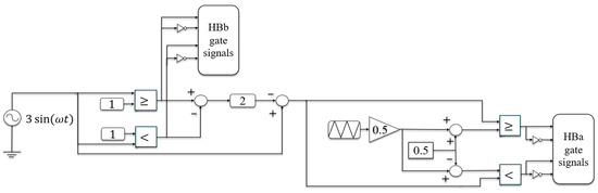 The PD-PWM technique, due to its high switching frequency, leads to increased switching losses, whereas the SMS, operating at a frequency comparable to the fundamental one, results in significantly lower switching losses. To address this trade-off, the proposed hybrid modulation technique was designed to combine the strengths of both strategies while mitigating their respective drawbacks. Figure 2 illustrates the operating principle of the proposed modulation scheme. The process of generating the HBb control signals remains the same as in SMS; however, the main distinction lies in the adoption of a high-frequency carrier signal to generate the control signals for HBa, which directly influences the system’s switching characteristics and harmonic performance.