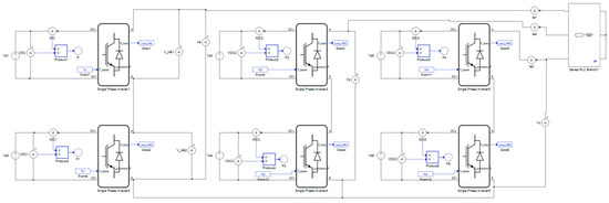 Simulation results are presented in this Section to compare the performance of a 3-P 7-L ACHBMLI under different modulation techniques. The analysis primarily examines the harmonic distortion present in the output voltages and currents, providing insights into the performance of each modulation technique. It should be emphasized that each modulation technique is applied individually in simulation and HIL testing. The comparison focuses on an in-depth analysis of the harmonic content of the output voltages and currents. The system under study, shown in Figure 3, consists of a 3-phase, 7-level ACHBMLI connected to a passive load composed of a resistor in series with an inductor. The parameters of both the ACHBMLI and the load are provided in Table 1.