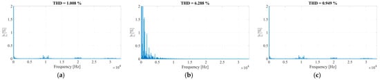 Figure 8 shows the waveforms of the line voltages and their respective spectra. In the case of PWM, the spectrum primarily contains harmonics multiples of the switching frequency (10 kHz), which are easily filtered by the load. Conversely, the SMS modulation spectrum exhibits significant low-frequency harmonics, while those above 10 kHz are of negligible magnitude. Particularly interesting is the analysis of Figure 8c, which relates to the hybrid technique: Although the HBb bridge switches at the fundamental frequency, the only harmonics present are multiples of 10 kHz, similar to PWM. The THD values of the output voltage for the PD-PWM, SMS, and hybrid techniques are 18.6%, 12.2%, and 19.44%, respectively.