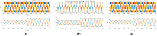 Additional tests were carried out to evaluate how the voltage and current vary following a change in load, specifically when the load is halved while maintaining a constant power factor. The results are presented in Figure 10. As can be observed, when the load is reduced, the voltage remains constant and is not affected by the variation, whereas the current increases for all modulation techniques. It should also be noted that no substantial differences are observed among the modulation techniques.