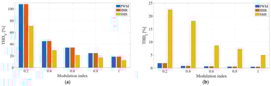 Although the THDV values for the three modulation techniques are comparable, their harmonic content is entirely different, as previously discussed. As a result, their THDI values vary significantly. In particular, the THDI of SMS is consistently much higher than that of PWM and the hybrid technique.