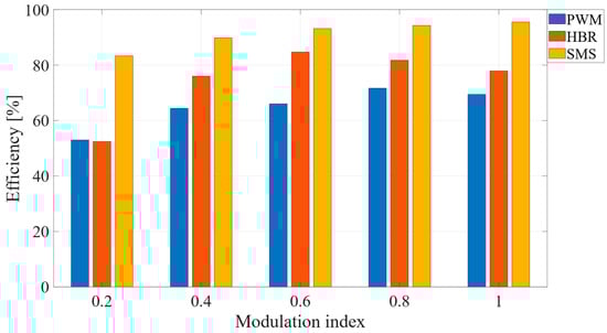 Analysing the efficiency of the converter under various operating conditions and for the three modulation techniques provides valuable insights. Also in this case, the modulation index varies from 0.2 to 1. As shown in Figure 12, the modulation strategy has a significant impact on the efficiency of the ACHBMLI, primarily due to differences in switching frequency. The SMS technique consistently achieves the highest efficiency across all operating conditions, as its switching frequency is significantly lower compared to the other modulation strategies, leading to reduced switching losses.
