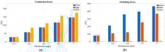 The higher efficiency of the SMS technique is attributed to the presence of low-frequency isofrequency components in both voltage and current spectra, which contribute to the active power. In contrast, PWM and HBR techniques operate at higher switching frequencies, resulting in increased switching losses. To further illustrate the impact of these losses, Figure 13 presents the distribution of both conduction and switching losses. It can be observed that PWM and HBR exhibit considerably higher switching losses compared to SMS, leading to superior overall efficiency for the latter. However, conduction losses are slightly higher in the SMS case. Consequently, the HBR technique represents a reasonable compromise between switching and conduction losses, offering a balanced trade-off between efficiency and thermal performance.