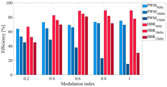 To highlight the impact of carrier frequency on the efficiency of the ACHBMLI, real-time tests were conducted with carrier frequencies of 5, 10, and 15 kHz for both the PD-PWM and HBR techniques. This analysis does not include SMS, since this technique operates at a constant switching frequency. As shown in Figure 14, for the same switching frequency and modulation index, the HBR technique consistently exhibits higher efficiency compared to PD-PWM. In general, it can be observed that increasing the switching frequency leads to reduced efficiency. This effect is more pronounced in the case of PD-PWM, where at 15 kHz the efficiency drops below 20%, whereas for HBR, even in the worst case, it remains above 30%. It should be noted that this study considers only the variation in switching frequency, although efficiency also depends on other factors such as dead time and the amplitude modulation index, as demonstrated in Ref. [23].