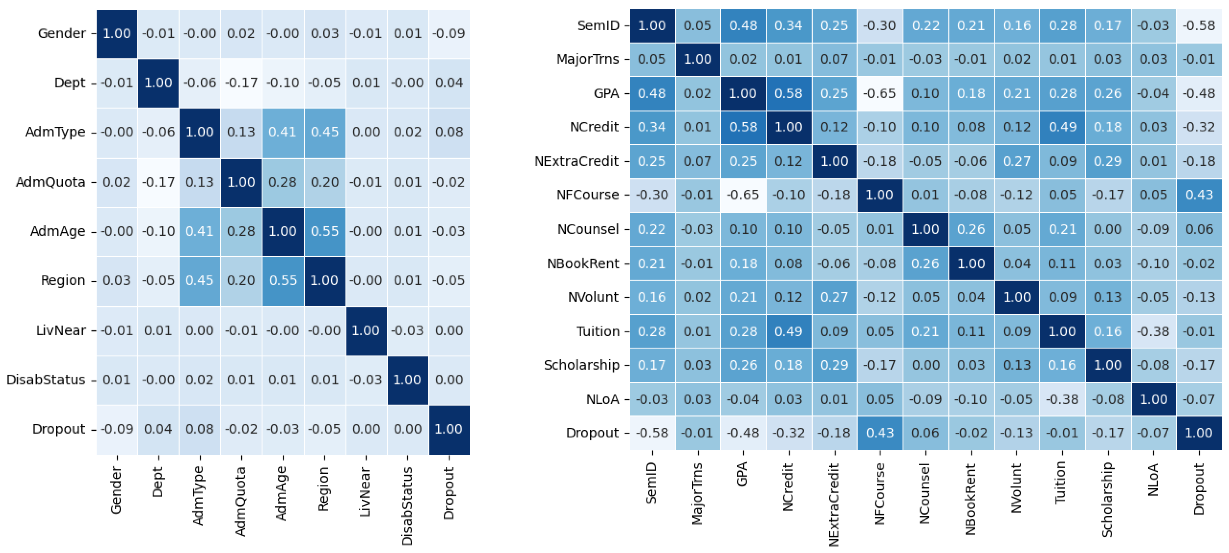 To calculate ρ , X , and Y must have the same shape. In our data, Y is Dropout, and X can be any attribute in Table 3 and Table 4. The attributes in Table 3 have the same shape as Dropout, whereas the attributes in Table 4 have a different shape. To calculate ρ for those attributes, a list of values in the semester records must be transformed into a single value. We used an average for the transformation since Song et al. [11] discussed that the mean-based summarization usually provides the best performance.