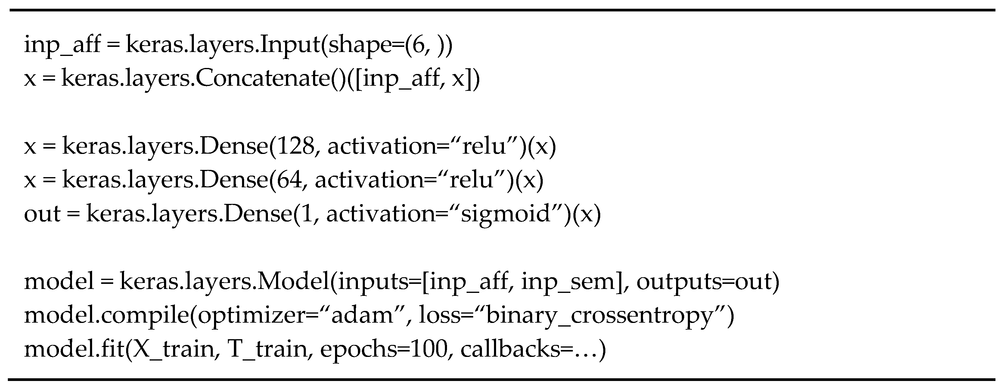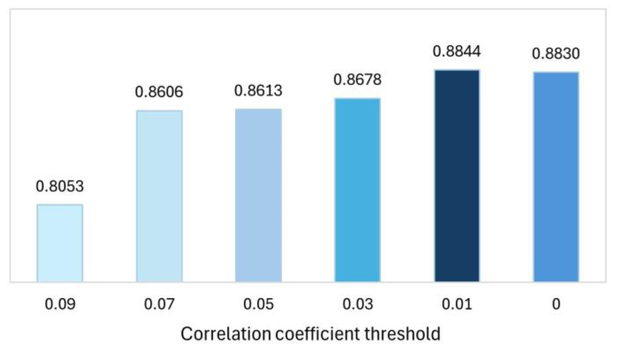 To select attributes used for learning, we checked various combinations of hyperparameters of a model and thresholds for correlation coefficients. As will be discussed in Section 4, we obtained the best performance when the threshold was set to 0.01. As a result, the attributes used for learning in the proposed method were summarized in Table 7. A total of 6 and 12 attributes were used, which represent students’ affiliation and academic achievement information, respectively.