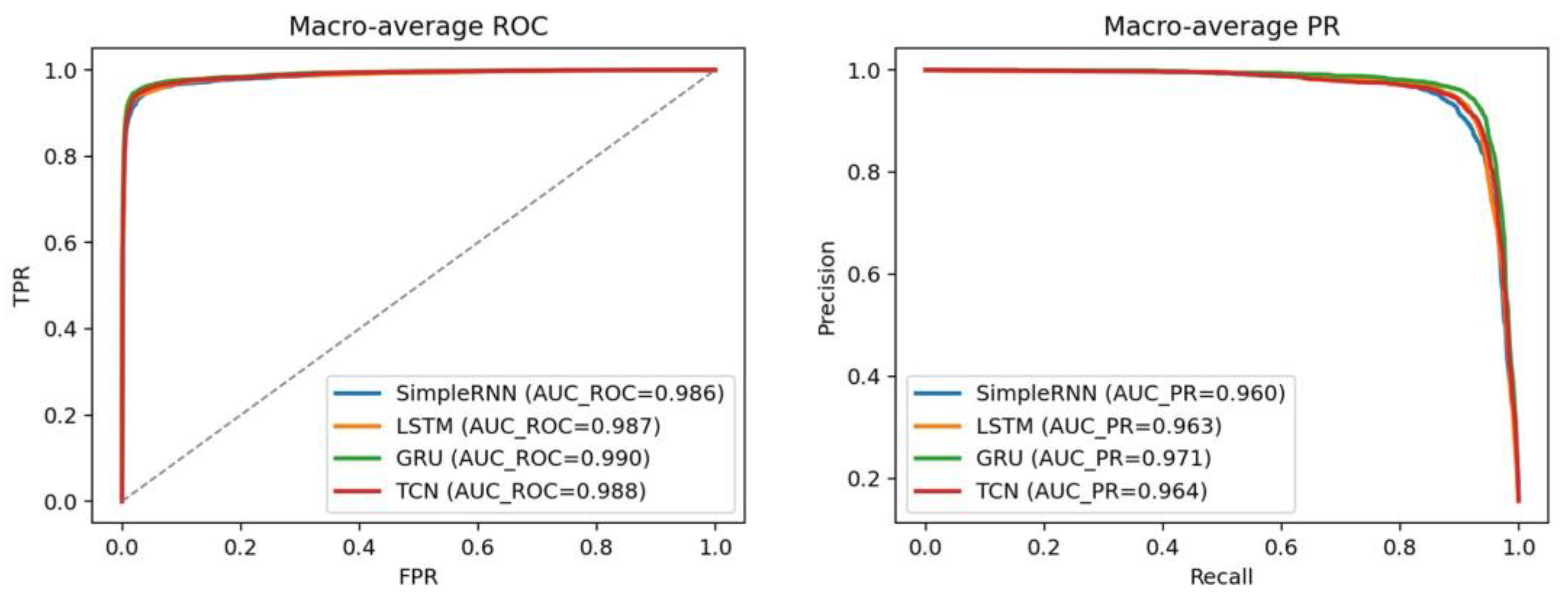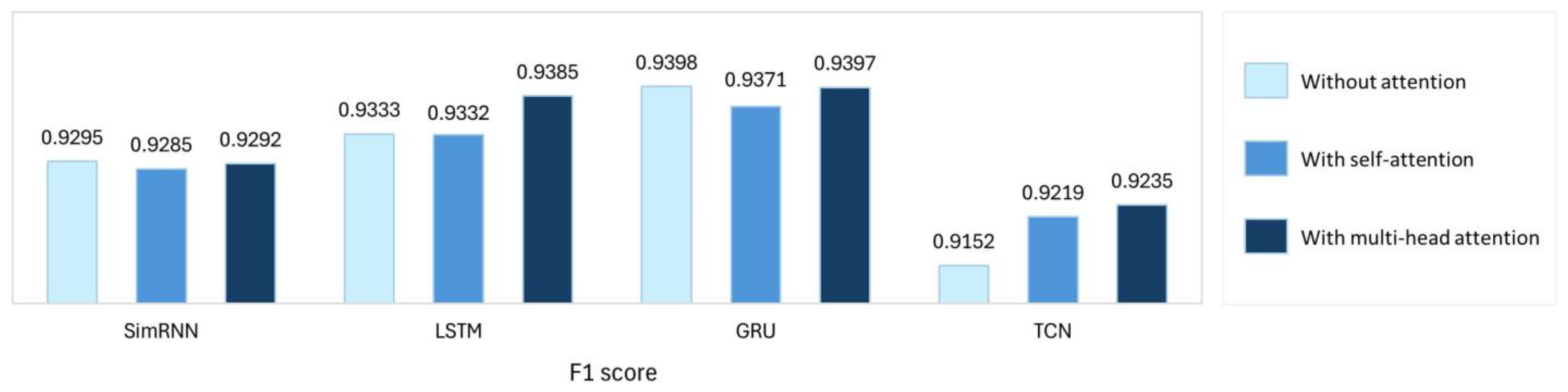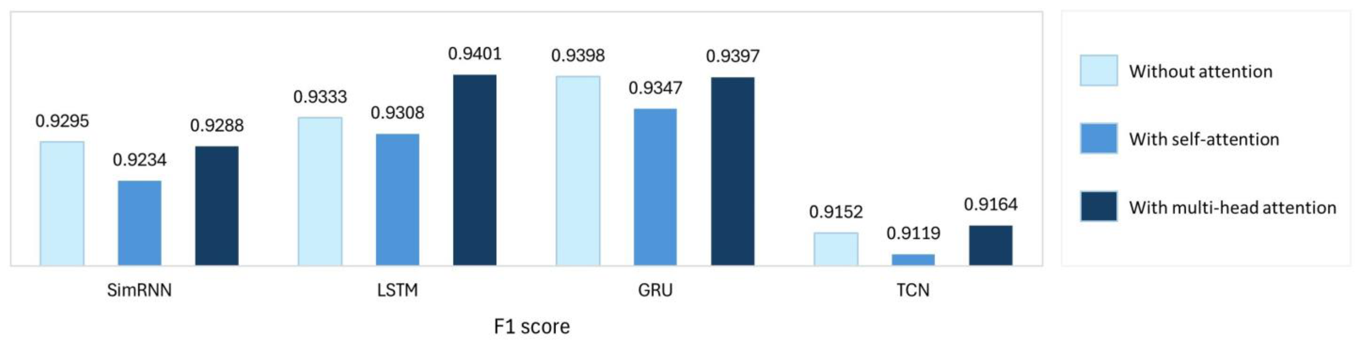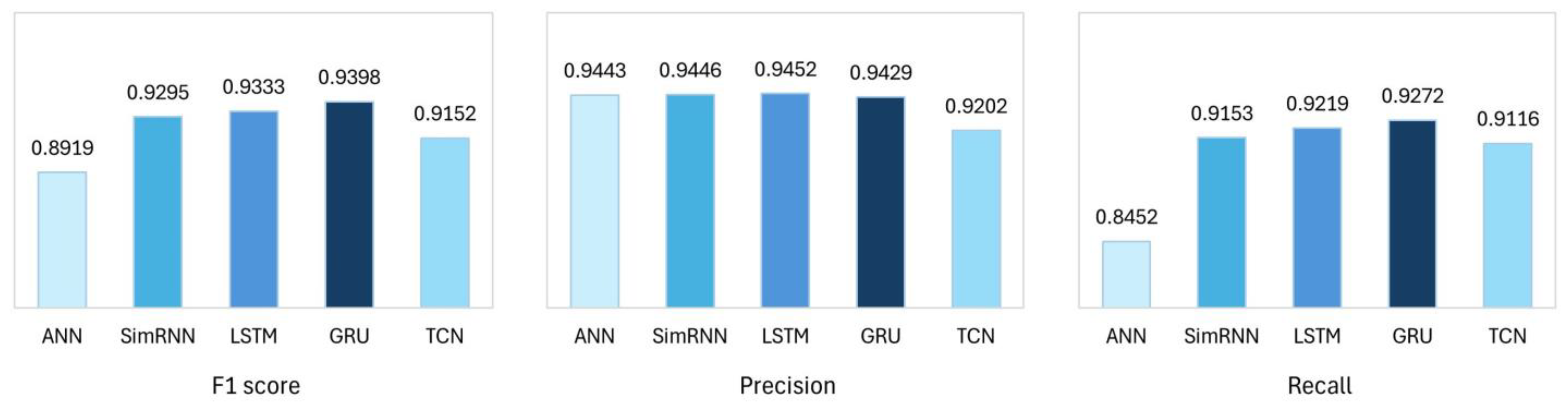 Figure 12. F1 scores, precision, and recall of the existing model (denoted as ANN) and basic SDP models without attention (denoted as SimRNN, LSTM, GRU, and TCN, respectively).