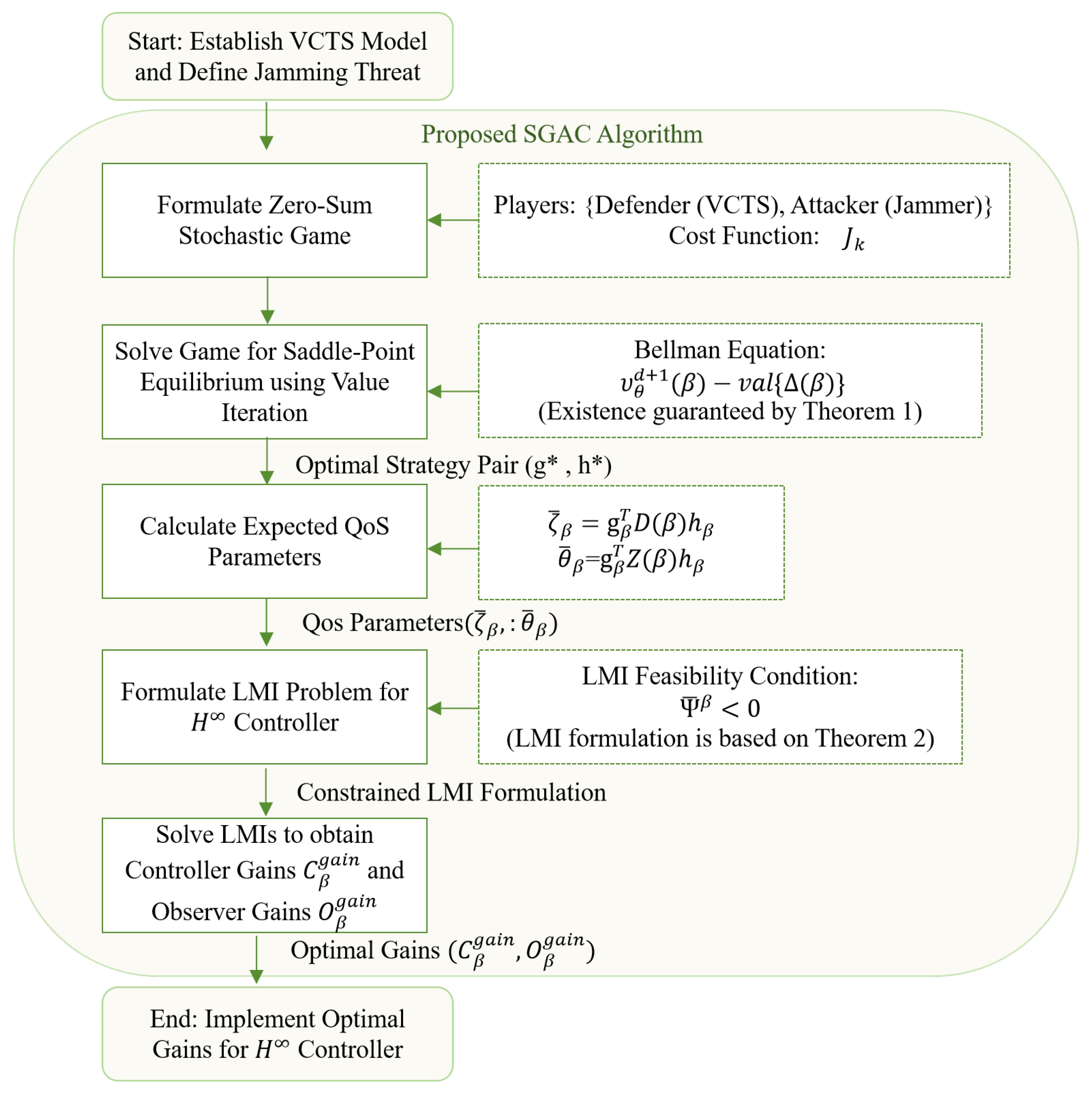 Figure 3, providing a detailed roadmap from problem formulation to final controller synthesis. At its core, SGAC formulates a zero-sum stochastic game between the attacker and defender, where jamming attacks are modeled as stochastic disturbances causing random packet losses. Solving for the saddle-point equilibrium yields the optimal probabilistic defense strategy, which is subsequently mapped to control actions through an