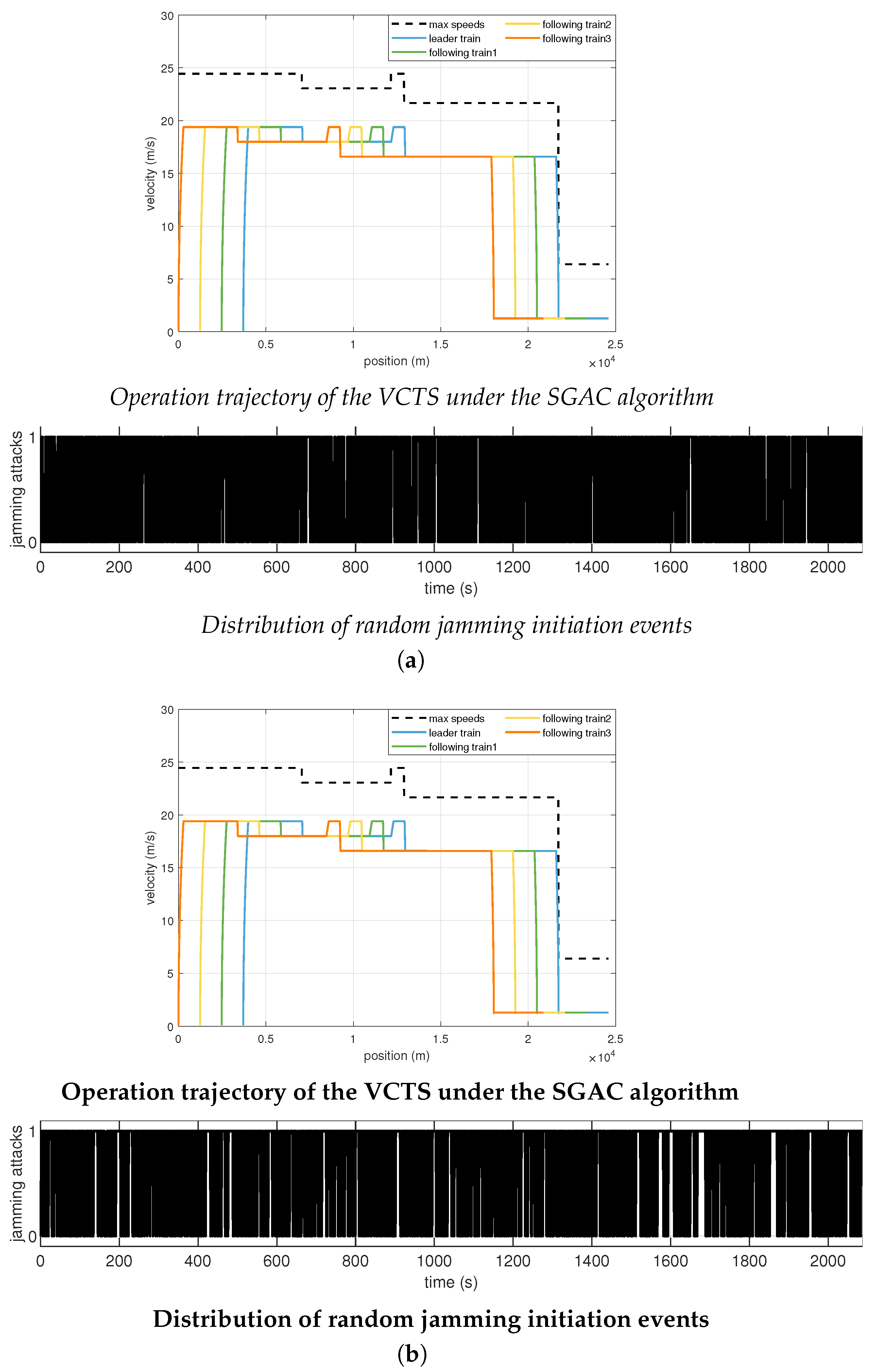 Figure 5 visualizes the corresponding random distribution of jamming events. Despite the visually evident increase in attack frequency and randomness, the operational trajectories demonstrate that platoon stability is well preserved across all scenarios. This qualitative observation is strongly corroborated by the quantitative data in