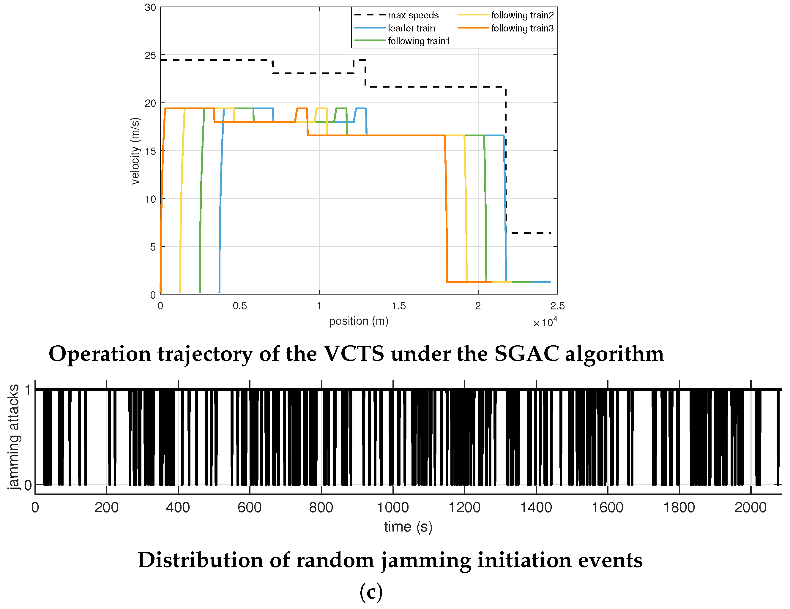 The preceding equations establish a mathematical linkage between the attacker–defender game strategies and the resulting QoS performance, providing a bridge through which the SGAC algorithm dynamically adjusts each train’s control input according to the real-time communication state. Based on this connection, the next section derives the performance metrics for the VCTS hybrid system, explicitly accounting for these game-dependent variables.