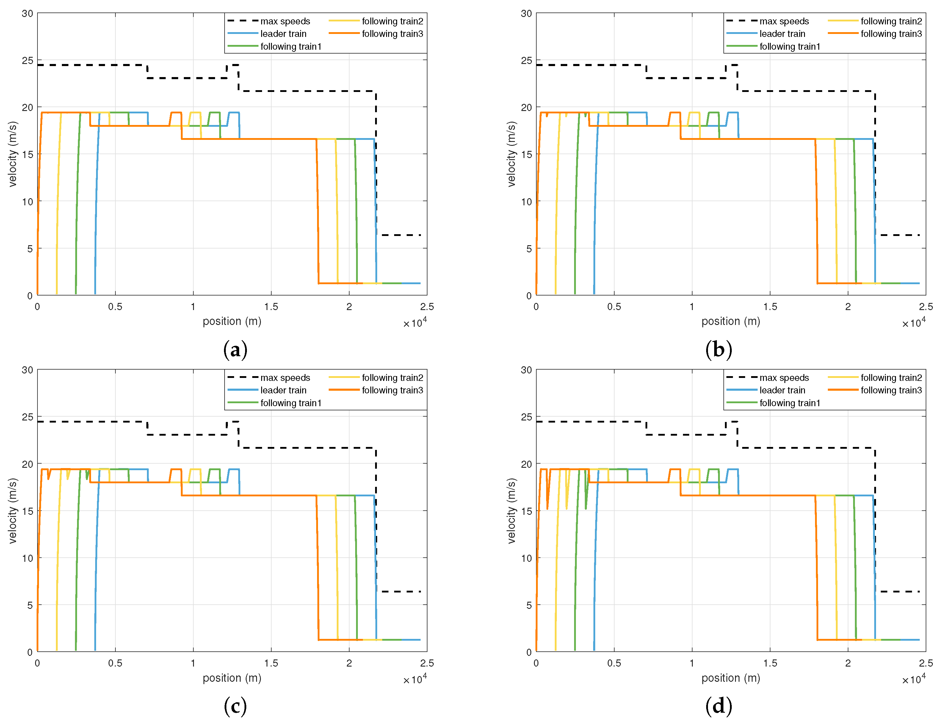 The simulation is based on a virtual platoon scenario consisting of four heavy-haul trains. The predefined target spacing between consecutive trains in the VCTS is set to 600 m. Each train is configured to include one HXD1 locomotive and fifty C80 carriages, resulting in a total train length of 635 m. The emergency braking deceleration is set to −0.6 m/s2.