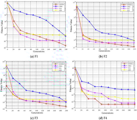 To verify the solving capability of the proposed GGHA, five benchmark test functions were selected, including two unimodal functions (F1–F2) and two multimodal functions (F3–F4), as specified in Table 3. Comparative evaluations were conducted against three classical algorithms: Genetic Algorithm (GA), Greedy Algorithm (GDA), and Particle Swarm Optimization (PSO), demonstrating GGHA’s performance across different types of function optimization problems.
