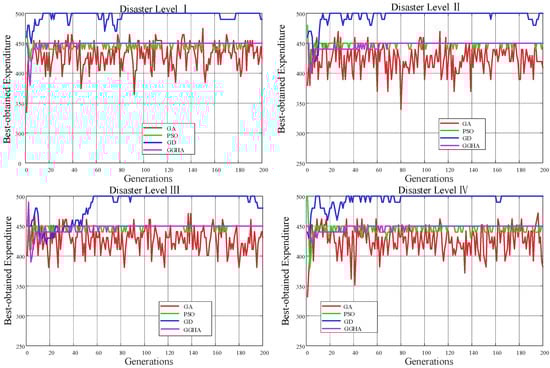 To rigorously validate the robustness and solution precision of the proposed algorithm in multi-objective constrained optimization, we conducted comprehensive comparative experiments across four distinct flood severity levels (I–IV). The fitness function was parameterized with weight coefficients (=1, =1000), budget constraint M = ¥100k (comprising RMB 80k for EVT deployment and RMB 20k for maintenance), and disaster loss threshold G = RMB 10M.