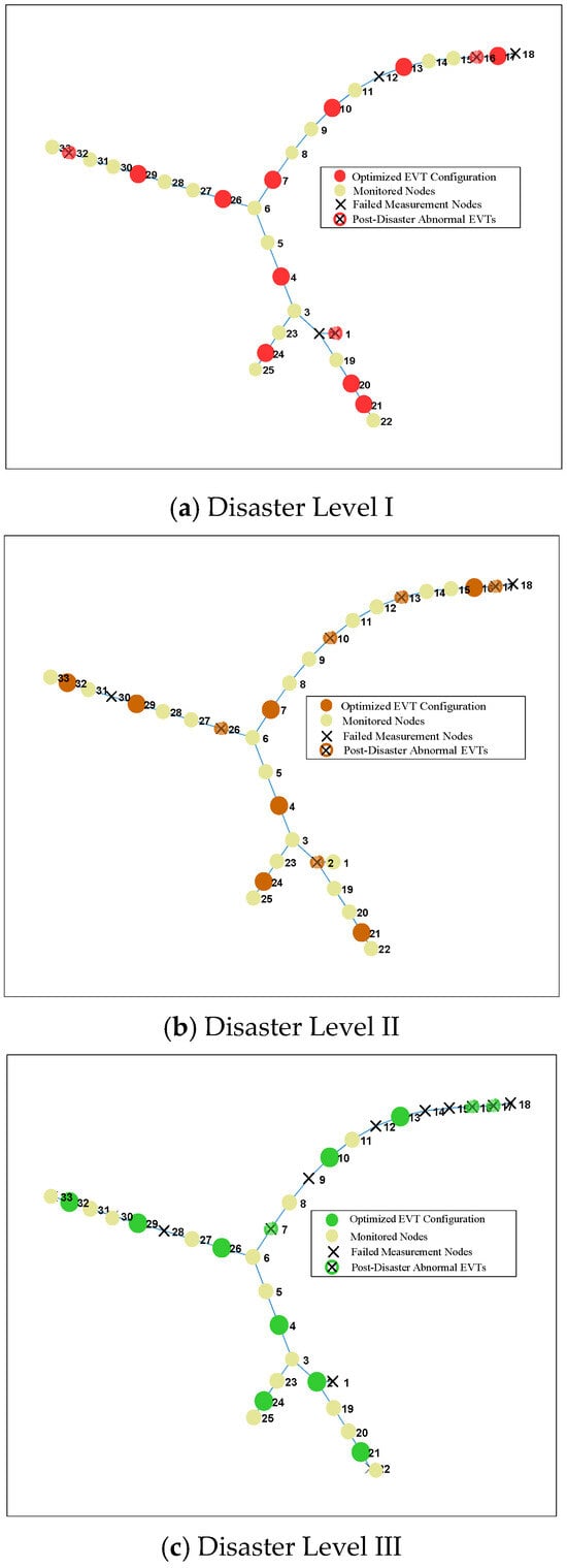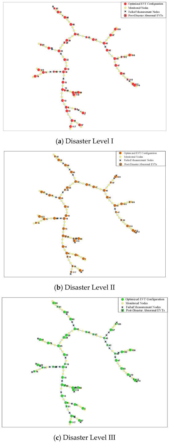 Figure 4 illustrates the optimal allocation and deployment of sensors using the proposed algorithm under four disaster levels. When the disaster level increases to Level 3, the layout of EVTs also exhibits a trend of clustering toward the main branches, enhancing system robustness by increasing redundant configuration at critical nodes. Further analysis of pre-disaster and post-disaster coverage rates is presented in Table 6. The results indicate a nonlinear impact of disaster levels on coverage: as the disaster level escalates, the disaster coverage rate decreases from 92.5% to 73.3%, a drop of 19.2%. This is because the decline in coverage remains gradual at lower disaster levels but becomes abrupt under higher disaster conditions. The significantly increased probability of node failures under severe disasters triggers cascading failures, leading to the loss of some critical observation nodes and disrupting the observability structure of the network.