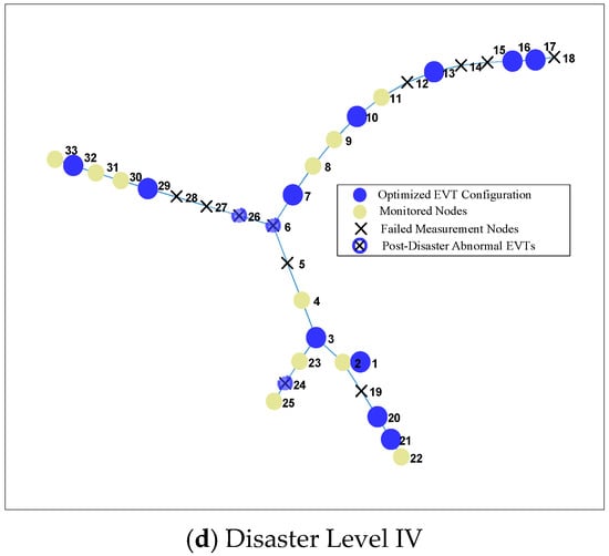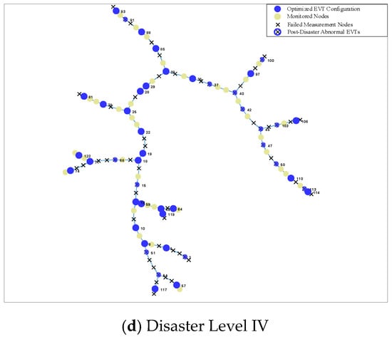As shown in Figure 3, all four disaster scenarios demonstrate a distinct “core-edge” deployment pattern for EVTs: dense monitoring networks are formed at critical topological nodes and major feeder convergence points, while sparse configurations are implemented for less important end-nodes with lighter loads. However, as disaster severity increases, the deployment focus gradually shifts toward nodes with higher elevations and stronger structural importance. Under Level I disaster conditions (Figure 3a), the algorithm preferentially deploys more monitoring devices near load centers to ensure comprehensive situational awareness during normal operations. In contrast, under Level IV disaster conditions (Figure 3d), EVT configurations become significantly concentrated in high-elevation nodes, demonstrating the algorithm’s intelligent recognition and adaptation to disaster risk propagation characteristics.