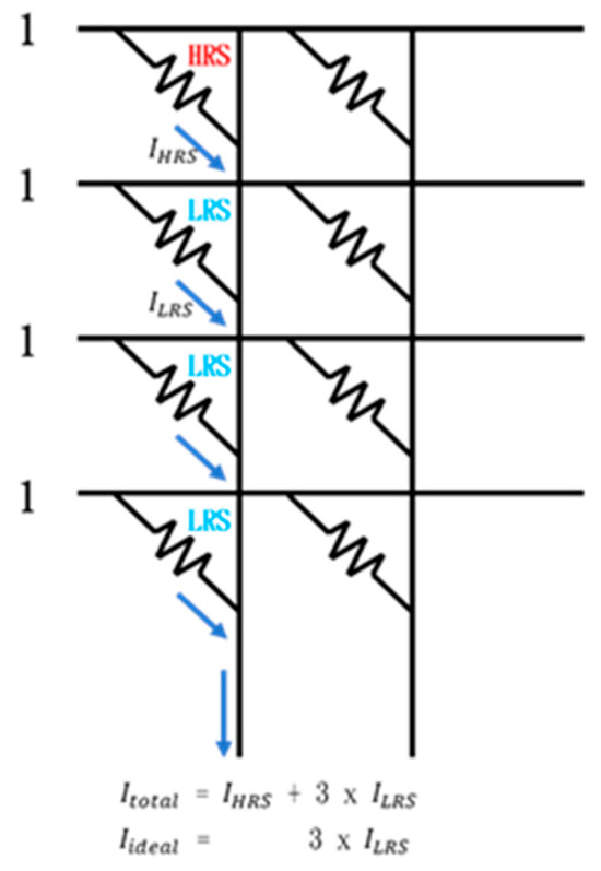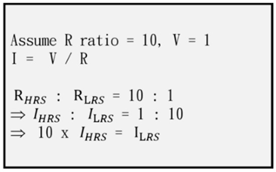 The resistance on/off ratio is the ratio of the high-resistance value to the low-resistance value (RHRS/RLRS = R OFF/R ON). As shown in the formula in Figure 3, we assume that the resistance on/off ratio is 10 and the voltage is 1, that is, RHRS:RLRS = 10:1. Through the formula I = V/R, we get IHRS:ILRS = 1:10, and finally, we get 10 × IHRS = ILRS.