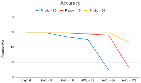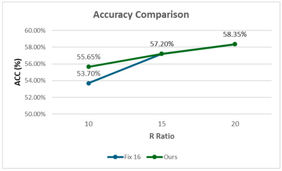 Table 10 lists the AWL configuration of each layer, accuracy, and the cycle count with different R ratios; we use the quantified accuracy, which is 59%, as the baseline. Compared with the “Fix 16” configuration, our methodology has better accuracy with an R ratio of 10 and has better computational efficiency with R ratios of 15 and 20. Figure 14 shows the accuracy comparison with different R ratios.