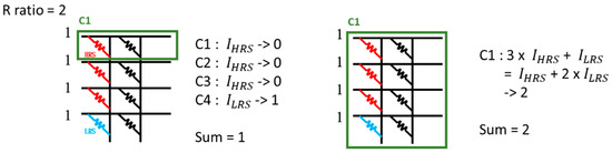 In RRAM CIM calculation, a current ILRS is generated through a low-resistance RRAM cell, and a current IHRS is generated through a high-resistance RRAM cell. Then the current accumulated by cells of the same bit line is converted through an analog-to-digital converter and a shifter to obtain the final calculation result. Ideally, the current generated by the high-resistance RRAM cell should be zero (IHRS = 0), which means that only ILRS accumulates and participates in the subsequent conversion process. However, in reality, a high-resistance RRAM cell still generates a weak current (IHRS ≠ 0), and the accumulation of multiple IHRS exceeds the tolerance range of the analog-to-digital converter, causing errors. For example, in Figure 2, there are one HRS cell and three LRS memory cells on the leftmost bit line. The ideal situation is the accumulation of current = 3 × , but the real situation shows = + 3 × . The extra may cause an error in the result.