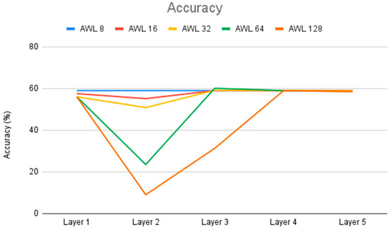 The adjustment of the AWLs in Figure 6 is based on the entire network; that is, all layers use the same number of AWLs. However, the number of AWLs does not have such a big impact on all layers. As shown in Figure 7, we only adjust the AWLs one layer at a time, and the other layers maintain the baseline AWLs that do not cause current deviation error. From Figure 7, we can see that the second layer of Cifar-10 is the layer most affected by the adjustment in AWLs, because this layer has the greatest number of rows in the weight matrix. In contrast, the third layer is less affected by adjusting AWLs in comparison with the second layer, because it has fewer rows in the weight matrix than the second layer. The first, fourth, and fifth layers are only slightly affected by the adjustment in AWLs because the number of rows in the weight matrix is not large in these layers. Through this experiment, we know that a layer with more rows in the weight matrix is more sensitive to the adjustment in AWLs. We can use a larger AWL configuration for the layers that are less sensitive to AWL adjustment, and a smaller AWL configuration for the layers that are sensitive to AWL adjustment.