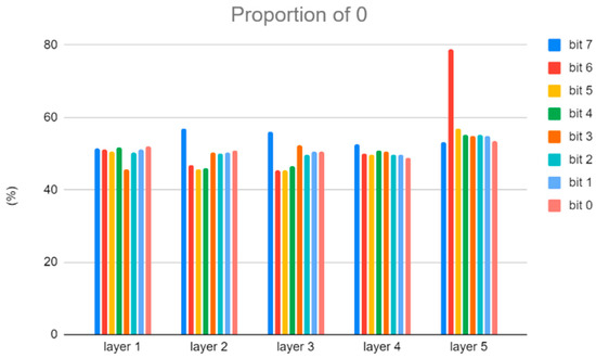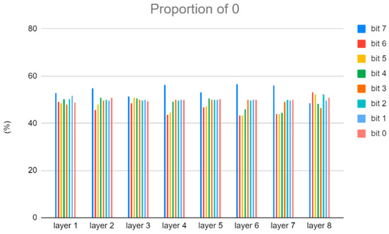 In addition, current deviation occurs when the weight bit is 0 and the IFM bit is 1. Reducing this situation can also reduce the current deviation error. Because the highest bit has the largest impact on the result, we will also use the proportion of 0 in the highest bit to adjust the AWL number. Figure 8 and Figure 9 show the proportion of 0 in the weight bits of Cifar-10 and VGG-8, respectively.
