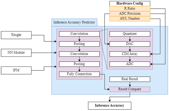 In this framework, the neural network model (or weights) is assumed to be pre-trained by software and then mapped to the inference CIM array. As shown in Figure 10, our predictor receives weights, a neural network model, a test dataset, and hardware constraints. We quantize the input weights and IFMs to a specified range based on the DAC precision within the input hardware constraints. These quantized weights and IFMs serve as inputs to the CIM array. The CIM array first maps the input weights to the array, representing them as high–low configurations. The IFMs are input as voltages from the WL direction and are calculated in batches based on the dynamic AWL configuration specified in the hardware constraints. The output is expressed as current, which includes current deviation. Finally, the inference model converts the CIM output current into a calculated result based on the R ratio and ADC precision within the hardware constraints. After the inference model is calculated, the predicted answer is compared with the real result.