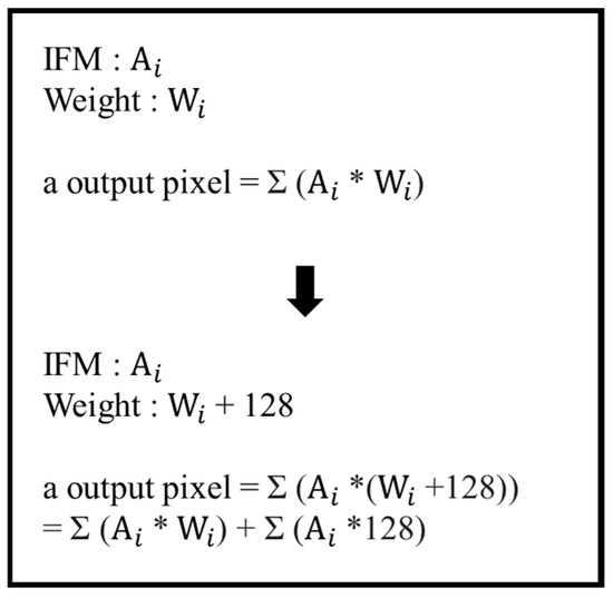 In the convolutional computation, we add 128 to the converted weight, so the weight conversion range becomes [0, 255]. The additional 128 will be deducted after the calculation is completed and will not affect the result. As shown in Figure 11, we can simply deduct Σ(Ai × 128) after the calculation without affect the computing result. This allows us to avoid the need for considering the positive and negative signs during the calculation process.