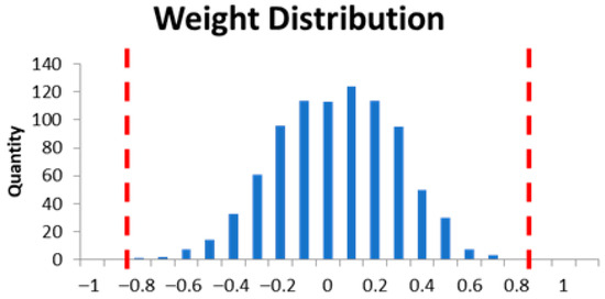 Figure 12 shows the weight distribution of Cifar-10. We can observe that the weight distribution exhibits a normal distribution, with most weights being concentrated around 0 (the center) and the weight distribution decreasing towards either side. Therefore, during quantization, we narrow the weight range from [−1, 1] to [−0.8, 0.8]. Weights larger than 0.8 are stored as 0.8, and weights smaller than −0.8 are stored as −0.8. By quantizing within a narrow range, we can create larger disparity between weights in the densely populated middle range, thereby improving accuracy. Formula (3) is the final weight quantification equation.