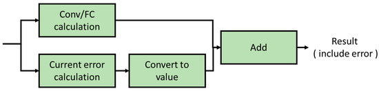 Overall, our custom simulator follows the architecture and parameters of NeuroSim, and we only modify the calculation of current deviation error. To calculate the current error, we need to compute it in bits, but this is very inefficient. So, we compute the correct result and the current error separately to speed up the simulation, as shown in Figure 13. The correct result is calculated as in Keras, multiplying the weights and the IFM and accumulating them. The current error is calculated by accumulating the number along the BLs with a weight of 0 and an IFM of 1. It is calculated in batches according to the AWLs, converted into a value, and then added to the correct result and stored. We use this approach to avoid performing accurate numerical calculations at the bit level and to discard the numerical conversion of the current of the high-configuration computing memory unit that does not cause errors.