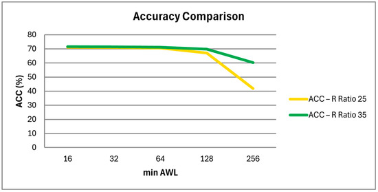 In addition, all three tables show a significant drop in accuracy when the minimal AWL number is increased to 256. Therefore, we can conclude that for R ratios of 25 and 35, increasing the minimal AWL number from 16 to 32 or 64 yields the best results.