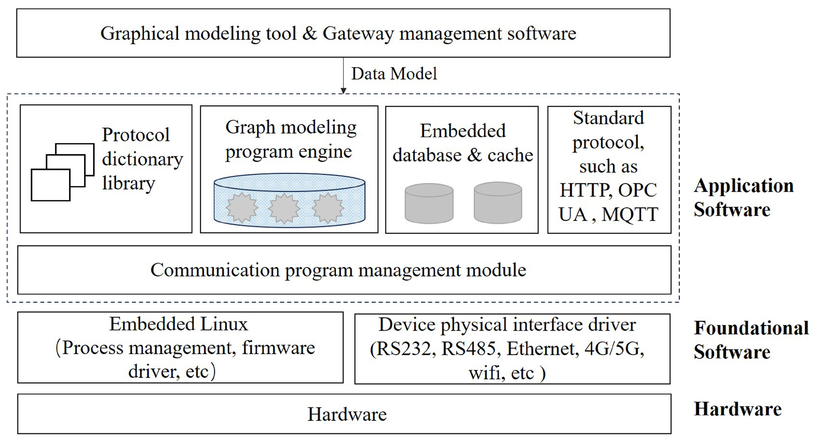 The software-defined paradigm plays a critical role in the design of GMGbox. Centered on software, it employs layered system design and modular software decoupling methods to realize the key capabilities of interoperability gateways. As shown in Figure 1, the gateway adopts a layered architecture design. The resources of the underlying hardware and fundamental software (Linux kernel and device drivers) are abstracted and encapsulated, providing services to the upper layers via a set of standard runtime Application Programming Interfaces (APIs). Building upon these APIs, the gateway application software layer implements core business logic such as device protocol parsing, data storage, and data conversion. Within the application software layer, GMGbox adopts a decoupled modular approach to further divide the application software into fixed common modules like communication management, the graphical modeling program engine and the database, and user-configurable distinct parts.