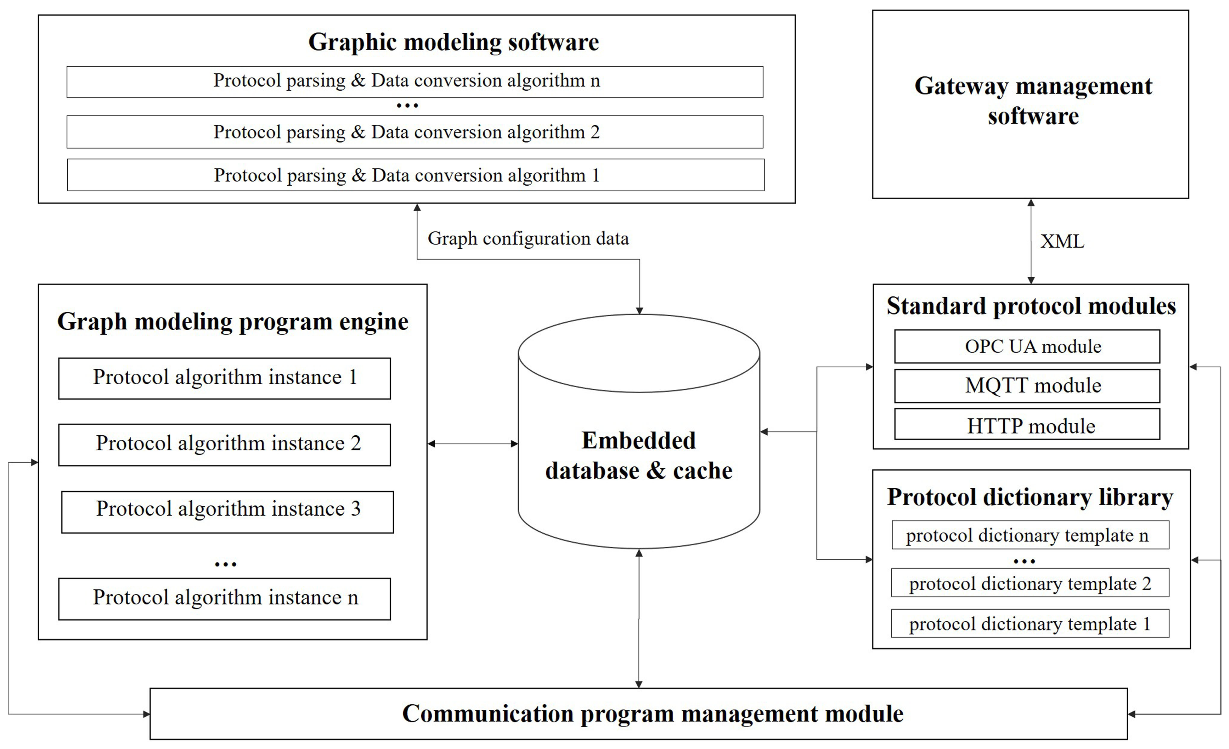 To adapt to the complex and variable protocol communication environment in industrial fields, such as the expansion of industrial control systems, the diversification of data formats of newly connected industrial devices, and the sharp increase in communication points, the designed gateway system is equipped with graphical modeling configuration software and gateway management software that can run on supervisory machines. The mapping relationships between different bit parameters in industrial data acquisition transmission frames can be defined by graphical modeling software, described using a function block graphical modeling language. This software provides a visual parameter configuration environment, enabling the visual configuration and dynamic adjustment of parameter information. The transmission sequences of standard protocols (e.g., OPC UA, MQTT, HTTP) are defined by the gateway management software, supporting the configuration of protocol communication parameters using XML.