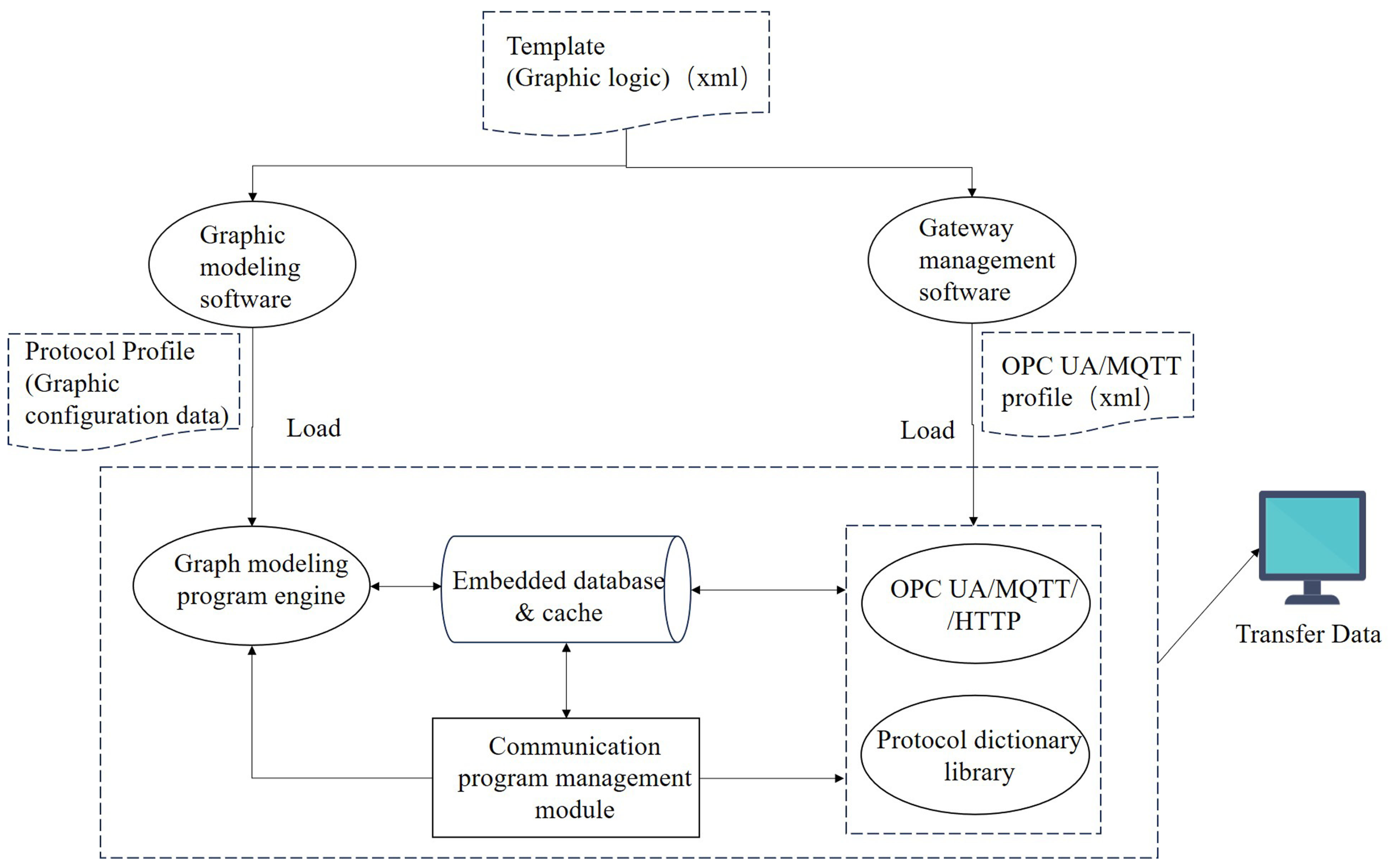 Figure 4 shows the workflow of GMGbox interoperability gateway. The basic workflow of the gateway is as follows: First, the graph modeling program engine converts parameters (such as the target device address, packet length, etc.) into protocol request data based on the pre-configured graphical protocol algorithm logic, and places this data into a designated buffer. Subsequently, the communication program management module reads these request data, loads the protocol dictionary, generates device connection and communication task instructions. It then invokes the underlying physical driver interface to forward and manage the communication data, thereby enabling the storage and transmission of the collected data. Next, the graph modeling program engine, in conjunction with the received response data and protocol algorithm instances, parses and converts the data portion of the transmission frames, storing the results in an embedded in-memory database. Simultaneously, the communication program management module loads OPC UA/MQTT/HTTP modules according to the pre-configured standard protocol XML configuration information to facilitate the transmission of uplink and downlink data.