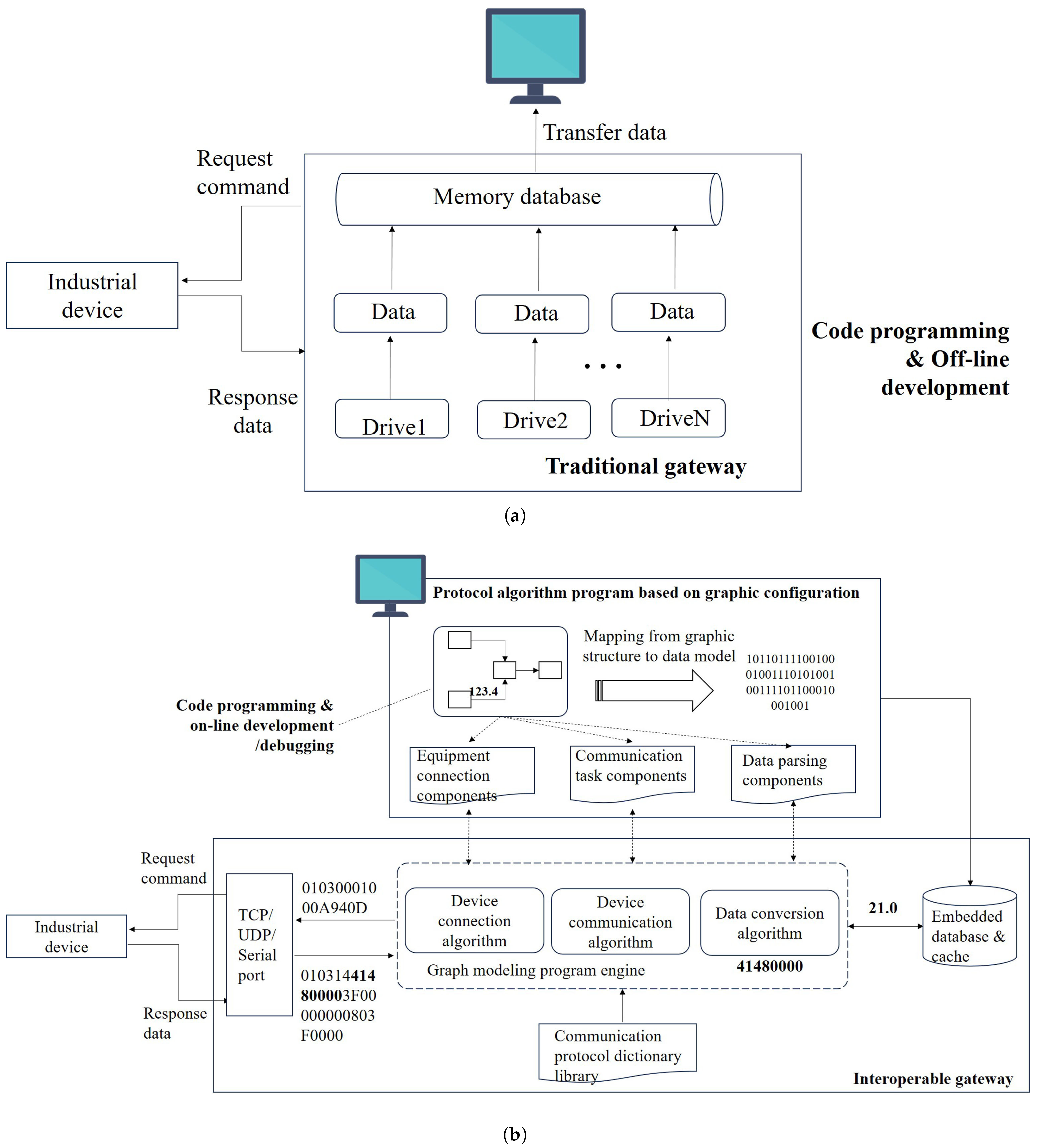 Figure 5. Comparison of protocol parsing and data conversion methods: (a) protocol parsing method based on driver code programming; (b) protocol analysis method based on graphic modeling.