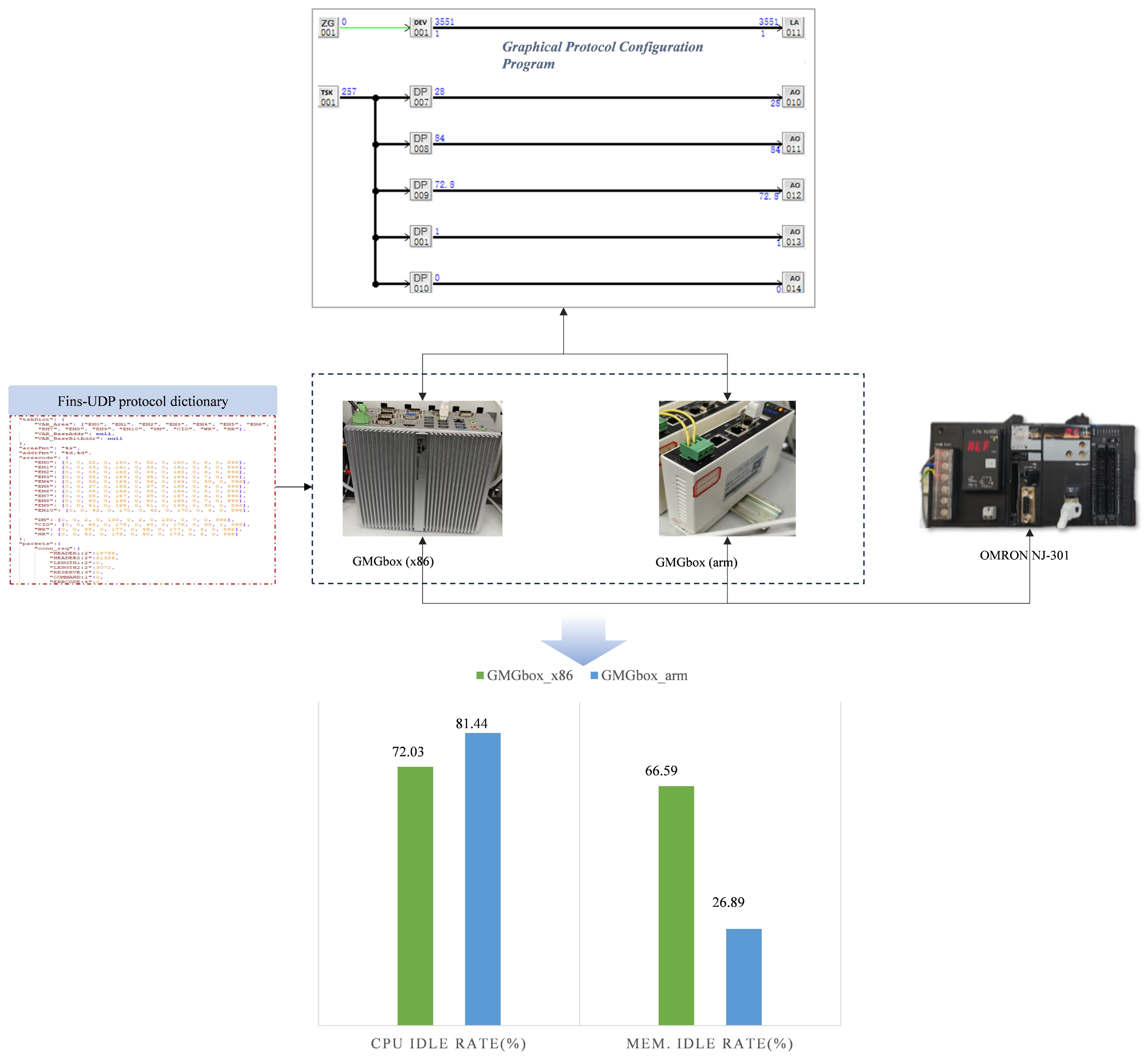 To evaluate the industrial applicability of the proposed gateway architecture, this study selected an Omron NJ-301 PLC (using the Fins-UDP protocol) as the target device. Identical graphical protocol parsing programs and protocol dictionaries were deployed on two gateway prototypes based on x86 and ARM architectures respectively, to acquire five real-time data points from this PLC while simultaneously monitoring the hardware resource utilization of the gateways. The experimental results (Figure 7) demonstrate that gateways with both architectures successfully parsed and monitored the PLC’s real-time data correctly through graphical configuration. The graphical configuration process can be completed within 15 min, with the overall system resource consumption remaining at a low level. Even in the resource-constrained ARM-based device, the average CPU idle rates reached 81.44%, indicating the system’s potential capability to handle larger data scales and more complex protocol tasks.
