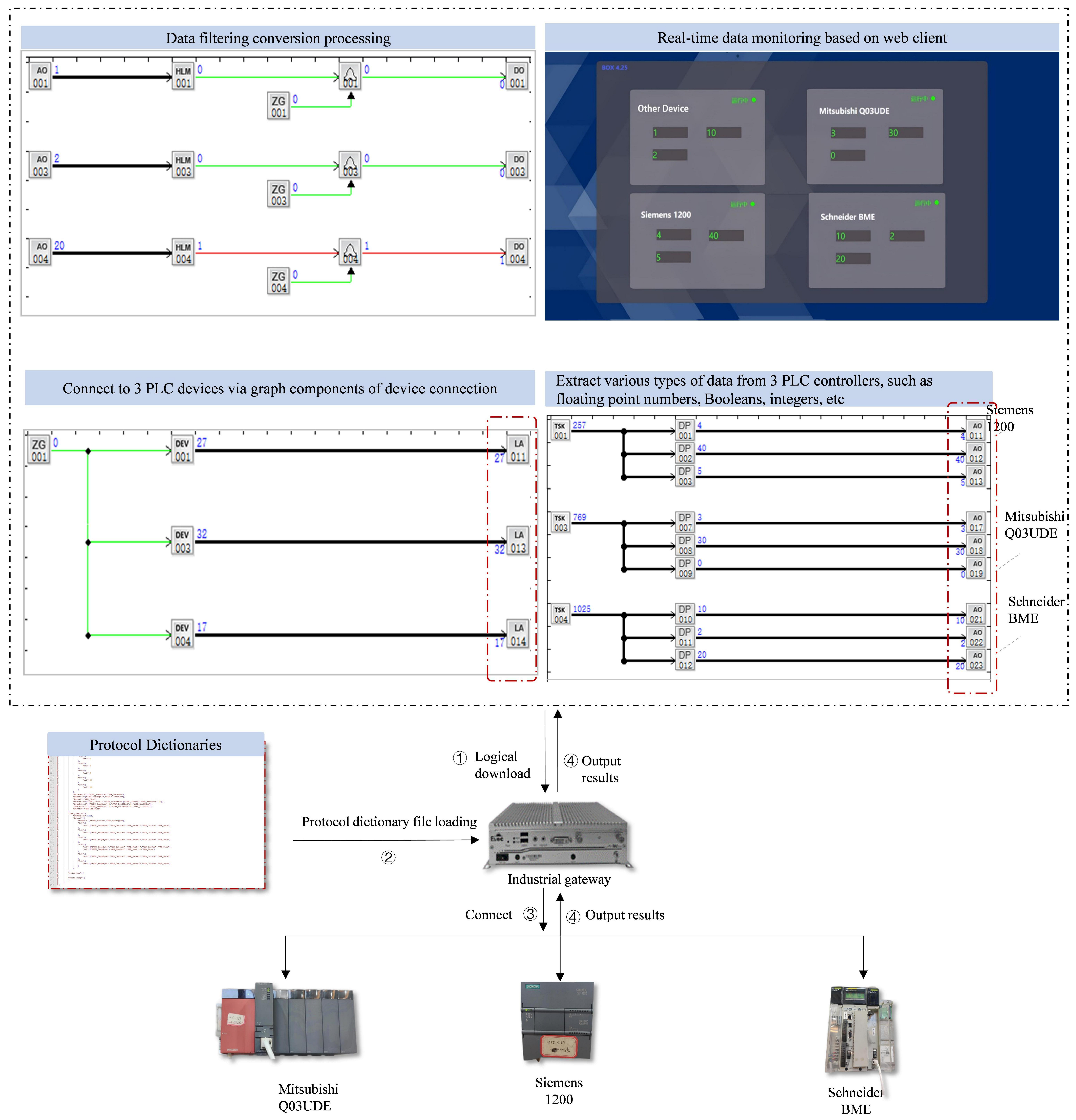 For validating the heterogeneous protocol data acquisition capability, three PLC controllers supporting different protocols were selected as data acquisition targets: the Mitsubishi Q03UDE, Siemens S7-1200, and Schneider BME. During the testing process, the protocol parsing algorithm logic was first programmed using the graphical modeling and configuration software on the PC and then loaded into the gateway for execution. Subsequently, the same configuration software and a Web client were used to monitor the parsed and converted data values and their dynamic trends in real-time. The experimental results are shown in Figure 8.