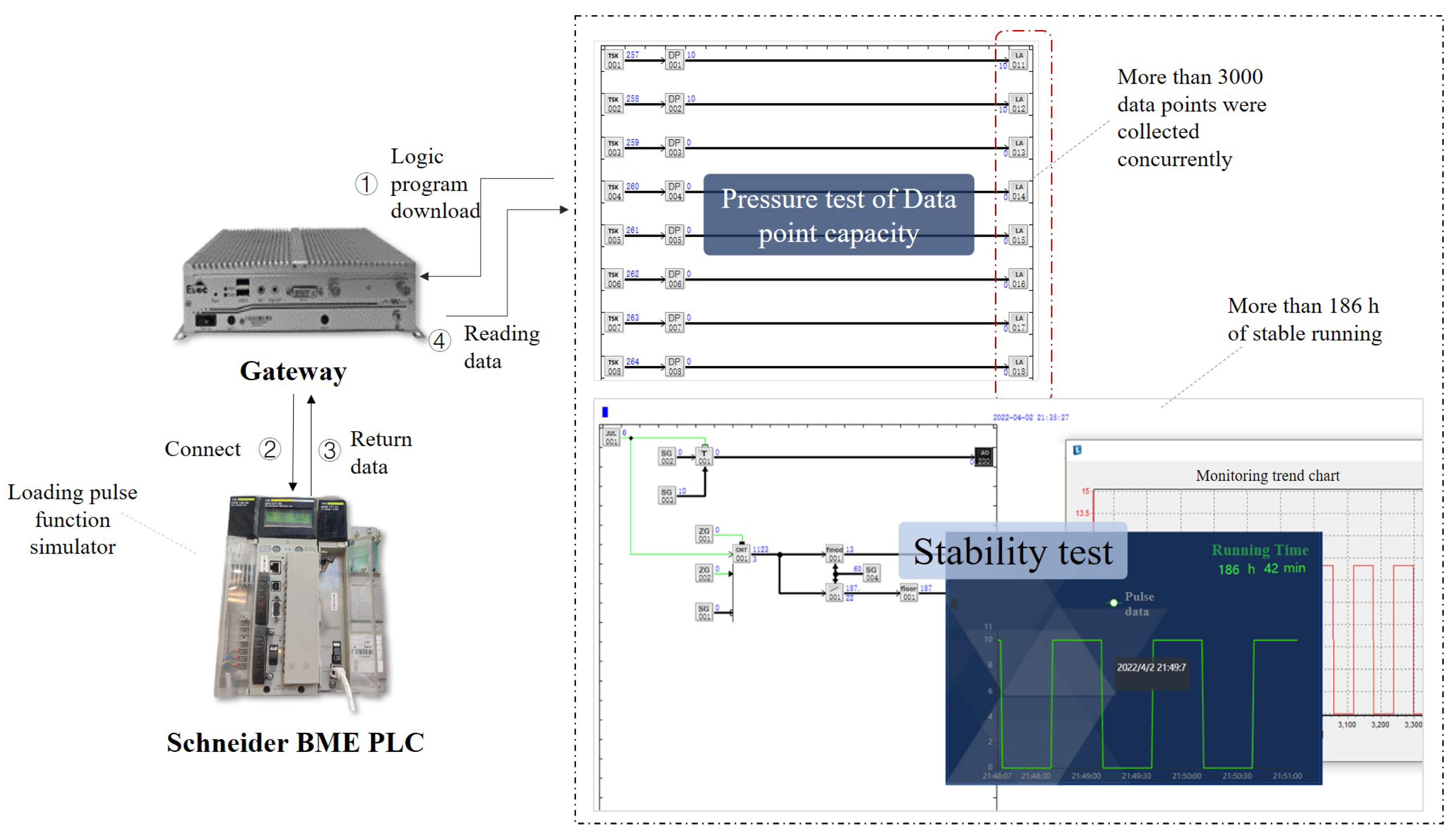 To validate the comprehensive performance of the proposed software-defined gateway in large-scale industrial access scenarios, a series of key capability tests were conducted. These tests encompassed heterogeneous protocol data acquisition, data acquisition success rate, data point capacity, system stability, concurrent load handling, and network anomaly management capabilities.